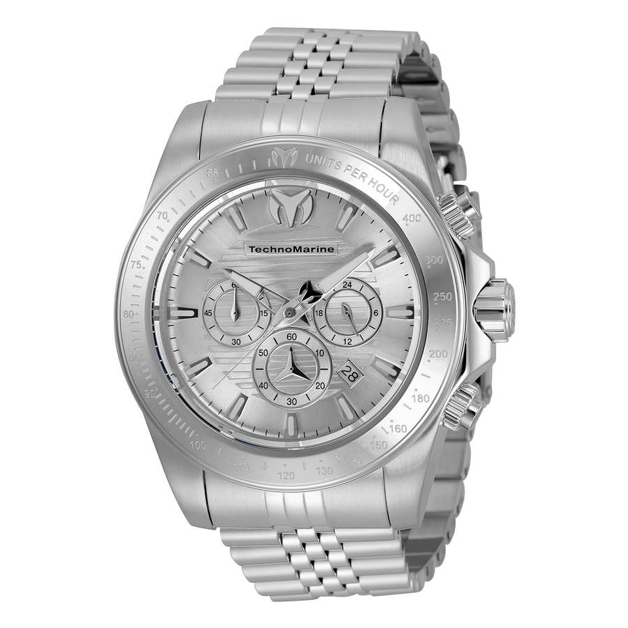 Stainless steel case with a stainless steel bracelet. Fixed stainless steel bezel showing tachymeter markings. White dial with luminous silver-tone hands and index hour markers. Minute markers around the outer rim. Dial Type: Analog. Luminescent hands and markers. Date display between the 4 and 5 o'clock positions. Chronograph - three sub-dials displaying: 60 second, 60 minute and 24 hour. Hattori caliber VD53 quartz movement. Scratch resistant mineral crystal. Screw down crown. Solid case back. Round case shape. Case size: 47 mm. Case thickness: 15 mm. Band width: 24 mm. Band length: 8.75 inches. Fold over clasp. Water resistant at 200 meters / 660 feet. Functions: chronograph, tachymeter, date, GMT, second time zone, hour, minute, second. Manta Grand Series. Sport watch style. Watch label: Japan Movt. Technomarine Manta Grand Silver-tone Dial Mens Watch TM-220139.