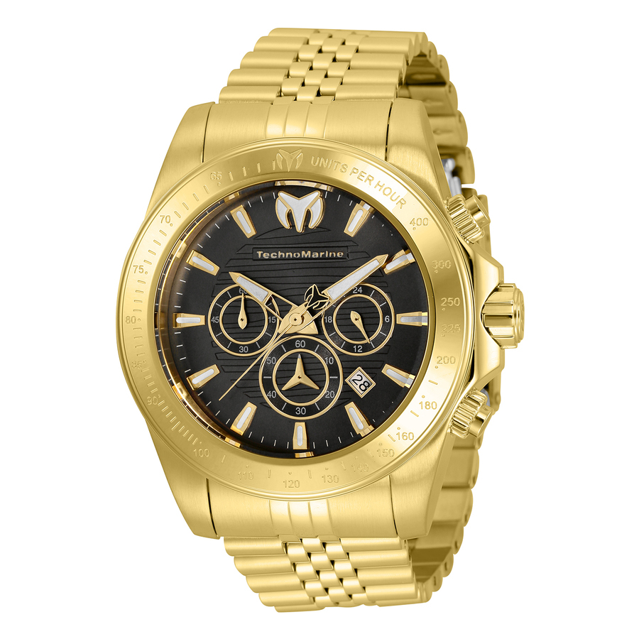 Gold-tone stainless steel case and bracelet. Fixed gold-tone stainless steel bezel. Black dial with gold-tone hands and index hour markers. Minute markers around the outer rim. Dial Type: Analog. Luminescent hands and markers. Date display between 4 and 5 o'clock position. Chronograph - three sub-dials displaying: 60 second, 60 minute and 24 hour. Hattori Caliber VD53 quartz movement. Scratch resistant mineral crystal. Screw down crown. Solid case back. Round case shape, case size: 47 mm, case thickness: 15 mm. Band width: 24 mm, band length: 8.75 inches. Buckle clasp. Water resistant at 200 meters / 660 feet. Functions: chronograph, date, GMT, second time zone, hour, minute, second. Manta Ray Series. Sport watch style. Watch label: Japan Movt. Technomarine Manta Ray Chronograph Black Dial Mens Watch TM-220148.