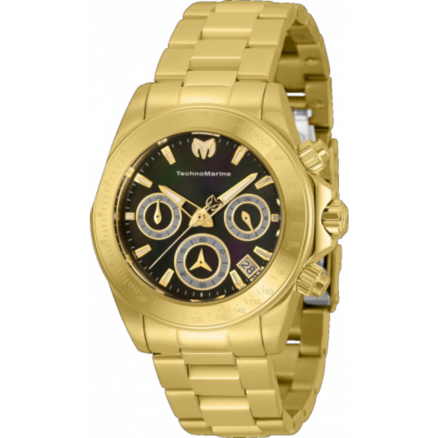 Gold-tone stainless steel case with a blue leather strap. Fixed gold-tone stainless steel bezel. Black dial with gold-tone hands and index hour markers. Minute markers around the outer rim. Dial Type: Analog. Luminescent hands and markers. Date display between 4 and 5 o'clock position. Chronograph - three sub-dials displaying: 60 second, 60 minute and 24 hour. Hattori Caliber VD53 quartz movement. Scratch resistant mineral crystal. Screw down crown. Solid case back. Round case shape, case size: 38 mm, case thickness: 13 mm. Band width: 26 mm, band length: 8 inches. Buckle clasp. Water resistant at 200 meters / 660 feet. Functions: chronograph, date, GMT, second time zone, hour, minute, second. Manta Ray Series. Sport watch style. Watch label: Japan Movt. Technomarine Manta Ray Chronograph Black Dial Unisex Watch TM-220046.