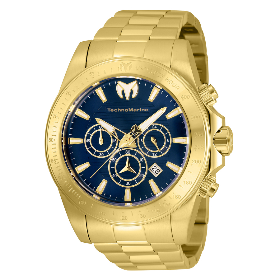 Gold-tone stainless steel case and bracelet. Fixed gold-tone stainless steel bezel. Blue dial with gold-tone hands and index hour markers. Minute markers around the outer rim. Dial Type: Analog. Luminescent hands and markers. Date display between 4 and 5 o'clock position. Chronograph - three sub-dials displaying: 60 second, 60 minute and 24 hour. Hattori Caliber VD53 quartz movement. Scratch resistant mineral crystal. Screw down crown. Solid case back. Round case shape, case size: 47 mm, case thickness: 14 mm. Band width: 24 mm, band length: 8.50 inches. Fold over clasp. Water resistant at 200 meters / 660 feet. Functions: chronograph, date, GMT, second time zone, hour, minute, second. Manta Ray Series. Sport watch style. Watch label: Japan Movt. Technomarine Manta Ray Chronograph Blue Dial Mens Watch TM-220132.