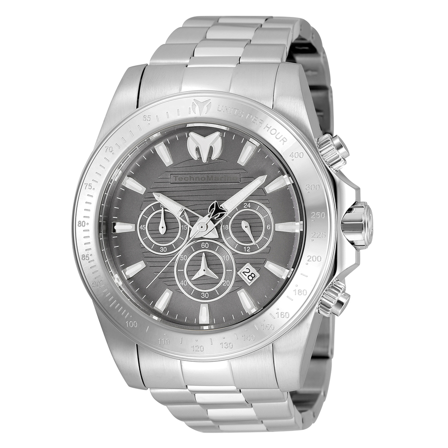 Silver-tone stainless steel case and bracelet. Fixed silver-tone stainless steel bezel. Charcoal dial with silver-tone hands and index hour markers. Minute markers around the outer rim. Dial Type: Analog. Luminescent hands and markers. Date display between 4 and 5 o'clock position. Chronograph - three sub-dials displaying: 60 second, 60 minute and 24 hour. Hattori Caliber VD53 quartz movement. Scratch resistant mineral crystal. Screw down crown. Solid case back. Round case shape, case size: 47 mm, case thickness: 14 mm. Band width: 24 mm, band length: 8.50 inches. Buckle clasp. Water resistant at 200 meters / 660 feet. Functions: chronograph, date, GMT, second time zone, hour, minute, second. Manta Ray Series. Sport watch style. Watch label: Japan Movt. Technomarine Manta Ray Chronograph Charcoal Dial Mens Watch TM-220124.