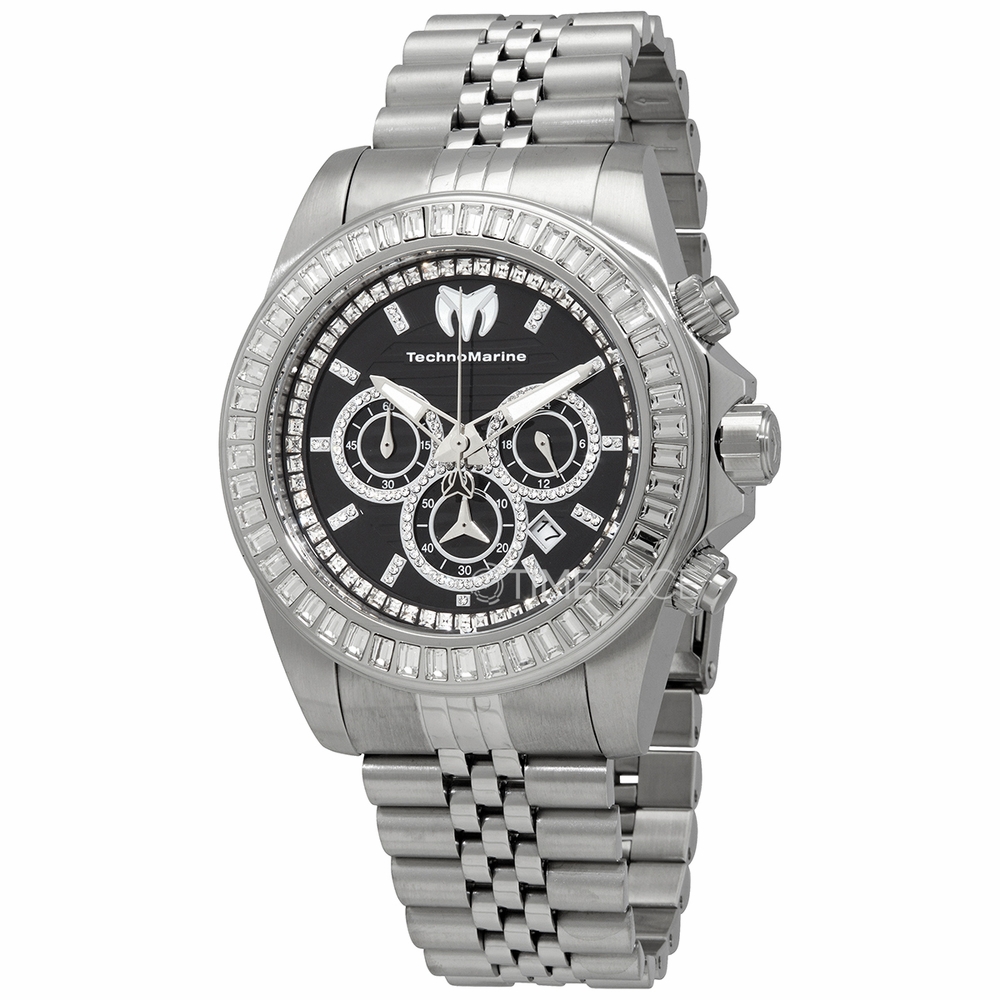 Stainless steel case with a stainless steel bracelet. Fixed stainless steel bezel set with baguette crystals. Black dial with luminous silver-tone hands and crystal index hour markers. Crystal minute markers around the outer rim. Dial Type: Analog. Luminescent hands. Date display between the 4 and 5 o'clock positions. Chronograph - three sub-dials displaying: 60 second, 60 minute and 24 hour. Hattori caliber VD53 quartz movement. Scratch resistant mineral crystal. Screw down crown. Solid case back. Round case shape. Case size: 47 mm. Case thickness: 14.1 mm. Band width: 24 mm. Band length: 8.75 inches. Fold over clasp with a safety release. Water resistant at 200 meters / 660 feet. Functions: chronograph, date, GMT, second time zone, hour, minute, second. Manta Series. Sport watch style. Watch label: Japan Movt. Technomarine Manta Ray Chronograph Quartz Crystal Black Dial Mens Watch TM-221000.