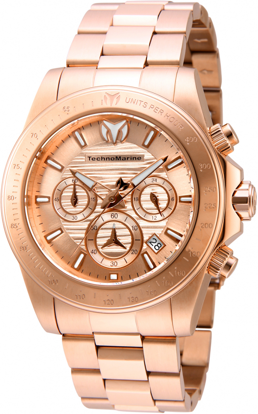 Rose gold-tone stainless steel case with a rose gold-tone stainless steel bracelet. Fixed tachymeter scale rose gold-tone stainless steel bezel. Rose gold-tone dial with rose gold-tone skeleton hands and index hour markers. Minute markers around the outer rim. Dial Type: Analog. Luminescent hands and markers. Date display between 4 and 5 o'clock position. Chronograph - three sub-dials displaying: 60 second, 60 minute and 24 hour. Hattori Caliber VD53 quartz movement. Scratch resistant sapphire crystal. Screw down crown. Solid case back. Round case shape, case size: 42 mm, case thickness: 13.1 mm. Band width: 22 mm, band length: 8.50 inches. Water resistant at 200 meters / 660 feet. Functions: chronograph, date, GMT, second time zone, hour, minute, second. Manta Ray Series. Sport watch style. Watch label: Japan Movt. Technomarine Manta Ray Chronograph Quartz Rose Gold Dial Mens Watch TM-219008.