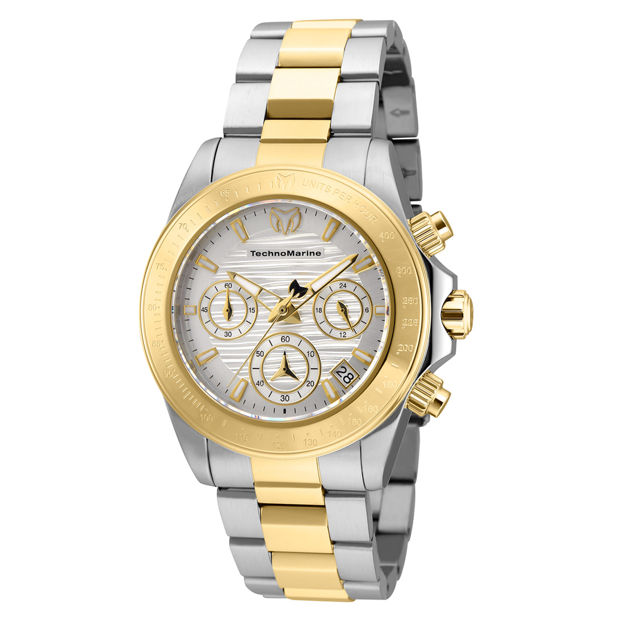 Gold-tone stainless steel case with a two-tone (silver-tone and gold-tone) stainless steel bracelet. Fixed gold-tone stainless steel bezel. Silver-tone dial with gold-tone hands and index hour markers. Minute markers around the outer rim. Dial Type: Analog. Luminescent hands and markers. Date display between 4 and 5 o'clock position. Chronograph - three sub-dials displaying: 60 second, 60 minute and 24 hour. Hattori Caliber VD53 quartz movement. Scratch resistant mineral crystal. Screw down crown. Solid case back. Round case shape, case size: 38 mm, case thickness: 13 mm. Band width: 22 mm, band length: 8 inches. Fold over clasp. Water resistant at 200 meters / 660 feet. Functions: chronograph, date, GMT, second time zone, hour, minute, second. Manta Ray Series. Sport watch style. Watch label: Japan Movt. Technomarine Manta Ray Chronograph Silver Dial Unisex Watch TM-219011.