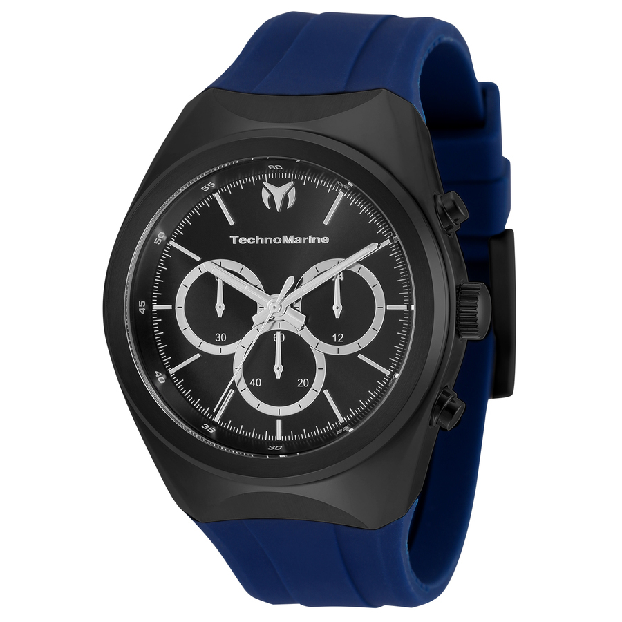 Black PVD stainless steel case with a blue leather strap. Fixed black PVD bezel. Black dial with silver-tone hands and index hour markers. Minute markers. Arabic numeral minute markers (at 5 minute intervals) around the outer rim. Dial Type: Analog. Chronograph - three sub-dials displaying: 60 second, 60 minute and 24 hours. Caliber VD54 quartz movement. Scratch resistant Hardlex crystal. Pull / push crown. Solid case back. Round case shape. Case size: 45 mm. Band width: 29 mm. Tang clasp. Water resistant at 200 meters / 660 feet. Functions: chronograph, hour, minute, second. Moonsun Series. Sport watch style. Technomarine MoonSun Chronograph Quartz Black Dial Mens Watch TM-820008.