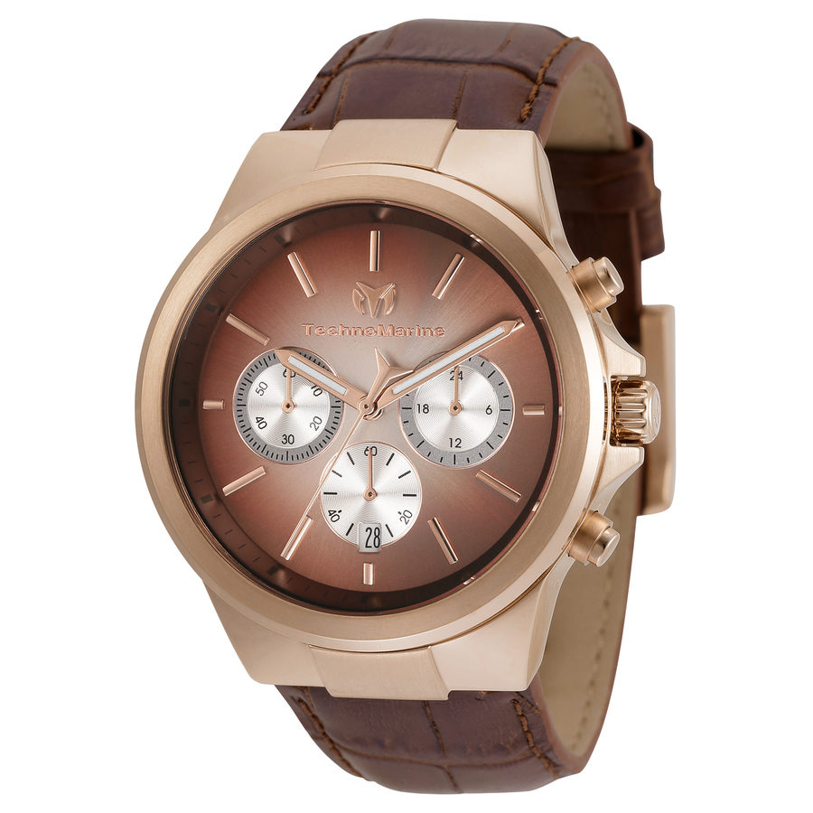 Rose gold-tone stainless steel case with a brown leather strap. Fixed rose gold-tone bezel. Rose brown dial with luminous rose gold-tone hands and index hour markers. Dial Type: Analog. Luminescent hands. Date display above the 6 o'clock position. Chronograph - three sub-dials displaying: 60 second, 60 minute and 24 hours. Caliber VD53 quartz movement. Scratch resistant Flame Fusion crystal. Pull / push crown. Solid case back. Round case shape. Case size: 42 mm. Case thickness: 10 mm. Band width: 24 mm. Tang clasp. Water resistant at 50 meters / 165 feet. Functions: chronograph, hour, minute, second. Moonsun Series. Casual watch style. Technomarine MoonSun Chronograph Quartz Rose Brown Dial Mens Watch TM-820015.