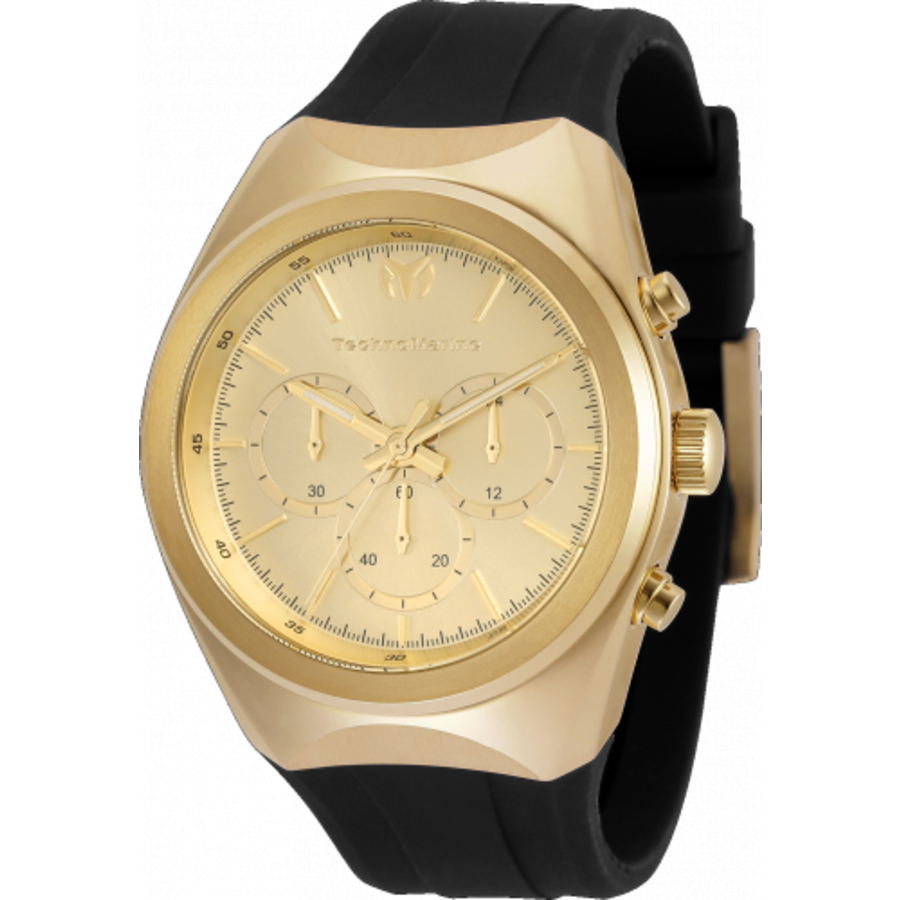 Gold-tone stainless steel case with a black leather strap. Fixed gold-tone bezel. Gold dial with luminous hands and index hour markers. Arabic Numeral Minute Markers (at 5 minute intervals). Dial Type: Analog. Luminescent hands and markers. Chronograph - three sub-dials displaying: 60 second, 60 minute and 24 hour. Caliber VD54 quartz movement. Scratch resistant Flame Fusion crystal. Pull / push crown. Solid case back. Round case shape. Case size: 45 mm. Band width: 26 mm. Tang clasp. Water resistant at 50 meters / 165 feet. Functions: chronograph, hour, minute, second. Moonsun Series. Casual watch style. Watch label: Japan Movt. Technomarine MoonSun Chronograph Quartz Gold Dial Mens Watch TM-820005.