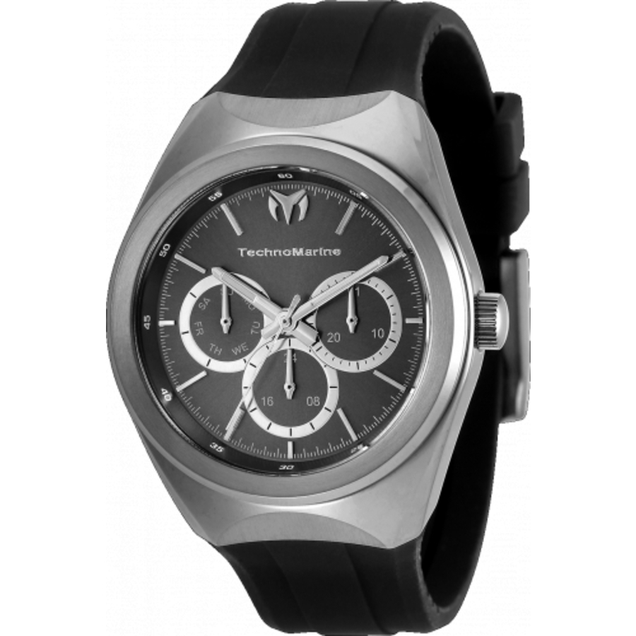 Stainless steel case with a black silicone strap. Fixed stainless steel bezel. Black dial with luminous silver-tone hands and index hour markers. Minute markers. Arabic numeral minute markers (at 5 minute intervals) around the outer rim. Dial Type: Analog. Luminescent hands and markers. Three multi-function sub-dials displaying: 24 hours, date and day of the week. Caliber VH63 quartz movement. Scratch resistant Flame Fusion crystal. Pull / push crown. Solid case back. Round case shape, case size: 40 mm. Band width: 24 mm. Tang clasp. Water resistant at 50 meters / 165 feet. Functions: date, day, hour, minute, second, 24 hour. Moonsun Series. Casual watch style. Watch label: Japan Movt. Technomarine MoonSun Quartz Black Dial Ladies Watch TM-820016.