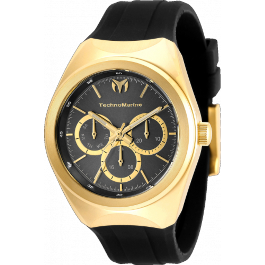 Gold-tone stainless steel case with a black silicone strap. Fixed gold-tone bezel. Black dial with luminous gold-tone hands and index hour markers. Minute markers. Arabic numeral minute markers (at 5 minute intervals) around the outer rim. Dial Type: Analog. Luminescent hands. Three multi-function sub-dials displaying: 24 hours, date and day of the week. Caliber VH63 quartz movement. Scratch resistant Flame Fusion crystal. Pull / push crown. Solid case back. Round case shape. Case size: 40 mm. Band width: 24 mm. Tang clasp. Water resistant at 50 meters / 165 feet. Functions: date, day, hour, minute, second, 24hour. Moonsun Series. Casual watch style. Technomarine MoonSun Quartz Black Dial Ladies Watch TM-820017.