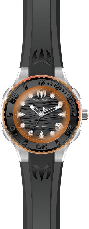 Steel, black stainless steel case with a black silicone strap. Black stainless steel bezel. Black dial with silver-tone hands and index hour markers. Minute markers around the outer rim. Dial Type: Analog. Luminescent hands and markers. Date display at the 4 o'clock position. SII caliber VJ52 quartz movement. Scratch resistant Flame Fusion crystal. Screw down crown. Solid case back. Round case shape, case size: 43 mm. Band width: 23 mm, band length: 8.50 inches. Buckle clasp. Water resistant at 200 meters / 660 feet. Functions: date, hour, minute, second. Casual watch style. Watch label: Japan Movt. Technomarine Quartz Black Dial Mens Watch TM-118030.