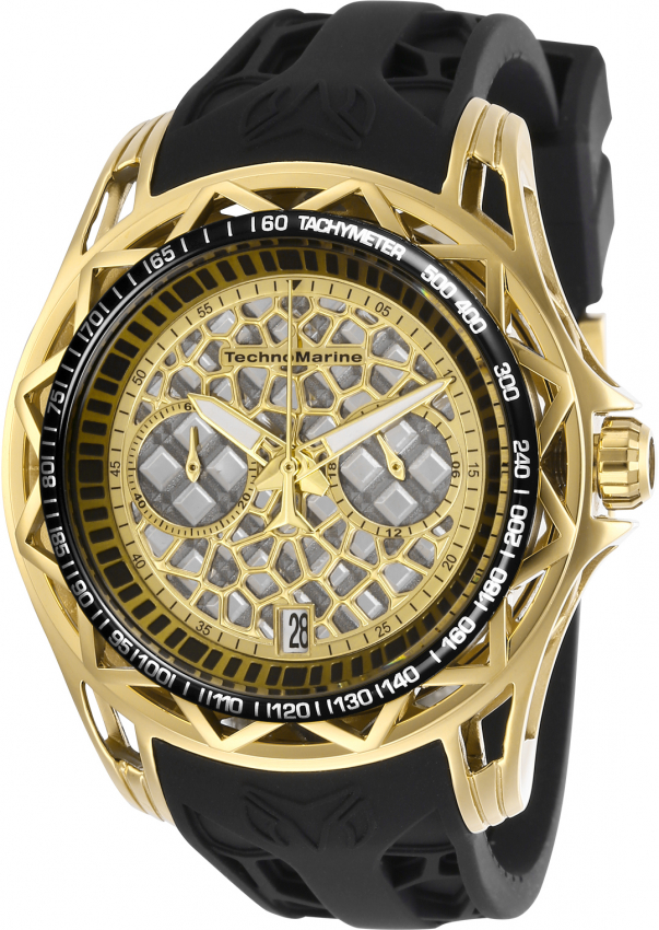 Yellow gold-tone stainless steel case with a black silicone strap. Fixed black aluminum bezel showing tachymeter markings. Silver (cell pattern) dial with luminous yellow gold-tone hands and index hour markers. Arabic numeral minute markers (at 5 minute intervals). Minute markers around the outer rim. Dial Type: Analog. Luminescent hands. Date display at the 6 o'clock position. Chronograph - two sub-dials displaying: 60 minute and 24 hour. SII caliber VK64 quartz movement. Scratch resistant mineral crystal. Screw down crown. Solid case back. Round case shape. Case size: 44 mm. Case thickness: 15.05 mm. Band width: 22 mm. Band length: 8.25 inches. Tang clasp. Water resistant at 200 meters / 660 feet. Functions: chronograph, date, hour, minute, second. Technocell Series. Dress watch style. Watch label: Japan Movt. Technomarine TechnoCell Chronograph Quartz Mens Watch TM-318031.