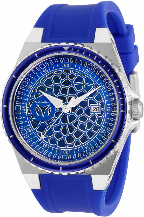 Stainless steel case with a blue silicone strap. Uni-directional stainless steel bezel with a blue ring. Blue (cell pattern) dial with silver-tone alpha-style hands and index hour markers. Arabic numeral minute markers (at 5 minute intervals). Minute markers around the outer rim. Dial Type: Analog. Luminescent hands. Date display at the 3 o'clock position. Hattori calibre VJ42 quartz movement. Scratch resistant flame fusion crystal. Pull / push crown. Solid case back. Round case shape. Case size: 44 mm. Case thickness: 13 mm. Band width: 26 mm. Band length: 8.75 inches. Tang clasp. Water resistant at 100 meters / 330 feet. Functions: date, hour, minute, second. Technocell Series. Sport watch style. Watch label: Japan Movt. Technomarine Technocell Quartz Blue Dial Mens Watch TM-318053.
