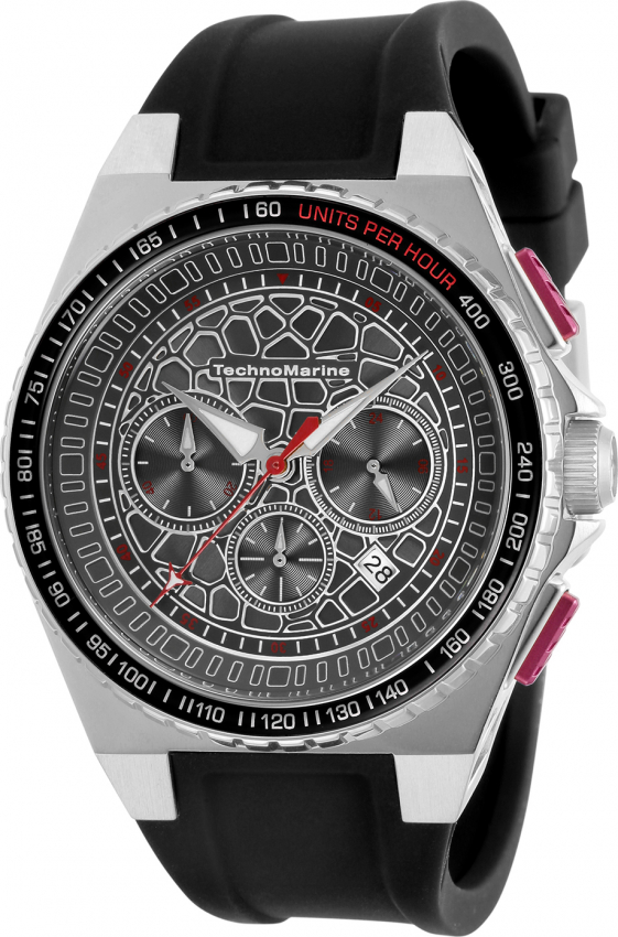 Silver-tone stainless steel case with a black silicone strap. Tachymeter scale black stainless steel bezel. Grey dial with silver-tone hands and Arabic numeral hour markers. Minute markers around the outer rim. Dial Type: Analog. Luminescent hands and markers. Date display between 4 and 5 o'clock position. Chronograph - three sub-dials displaying: 60 second, 60 minute and 24 hour. Hattori Caliber VD53 quartz movement. Scratch resistant flame fusion crystal. Pull / push crown. Solid case back. Round case shape, case size: 45 mm, case thickness: 13 mm. Band width: 26 mm, band length: 8.75 inches. Buckle clasp. Water resistant at 100 meters / 330 feet. Functions: chronograph, date, GMT, second time zone, hour, minute, second. Sport watch style. Watch label: Japan Movt. Technomarine Technocell Chronograph Quartz Grey Dial Mens Watch TM-318063.