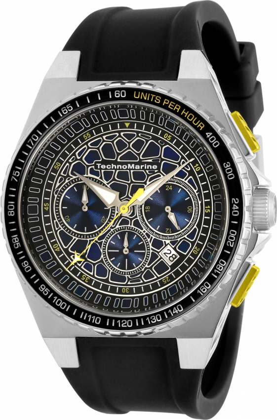 Silver-tone stainless steel case with a black silicone strap. Tachymeter scale black stainless steel bezel. Blue and black dial with silver-tone hands and Arabic numeral hour markers. Minute markers around the outer rim. Dial Type: Analog. Luminescent hands and markers. Date display between 4 and 5 o'clock position. Chronograph - three sub-dials displaying: 60 second, 60 minute and 24 hour. Hattori Caliber VD53 quartz movement. Scratch resistant flame fusion crystal. Pull / push crown. Solid case back. Round case shape, case size: 45 mm, case thickness: 13 mm. Band width: 26 mm, band length: 8.75 inches. Buckle clasp. Water resistant at 100 meters / 330 feet. Functions: chronograph, date, GMT, second time zone, hour, minute, second. Sport watch style. Watch label: Japan Movt. Technomarine Technocell Chronograph Quartz Mens Watch TM-318064.