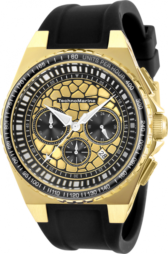 Gold-tone stainless steel case with a black silicone strap. Fixed gold-tone bezel with an inlaid black ring showing tachymeter markings. Black and gold dial with silver-tone hands and Arabic numeral hour markers. Arabic numeral minute markers (at 5 minute intervals). Minute markers around the outer rim. Dial Type: Analog. Luminescent hands. Date display between the 4 and 5 o'clock positions. Chronograph - three sub-dials displaying: 60 second, 60 minute and 24 hour. Hattori caliber VD53 quartz movement. Scratch resistant Flame Fusion crystal. Pull / push crown. Solid case back. Round case shape. Case size: 45 mm. Case thickness: 13 mm. Band width: 26 mm. Band length: 8.75 inches. Tang clasp. Water resistant at 100 meters / 330 feet. Functions: chronograph, date, GMT, second time zone, hour, minute, second. Technocell Series. Sport watch style. Watch label: Japan Movt. Technomarine TechnoCell Chronograph Quartz Mens Watch TM-318068.