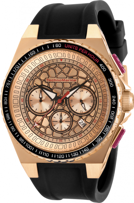 Rose gold-tone stainless steel case with a black silicone strap. Tachymeter scale black stainless steel bezel. Rose gold-tone dial with black hands and Arabic numeral hour markers. Minute markers around the outer rim. Dial Type: Analog. Luminescent hands. Date display between 4 and 5 o'clock position. Chronograph - three sub-dials displaying: 60 second, 60 minute and 24 hour. Hattori Caliber VD53 quartz movement. Scratch resistant flame fusion crystal. Pull / push crown. Solid case back. Round case shape, case size: 45 mm, case thickness: 13 mm. Band width: 26 mm, band length: 8.75 inches. Buckle clasp. Water resistant at 100 meters / 330 feet. Functions: chronograph, date, GMT, second time zone, hour, minute, second. Sport watch style. Watch label: Japan Movt. Technomarine TechnoCell Chronograph Quartz Rose Gold Dial Mens Watch TM-318069.