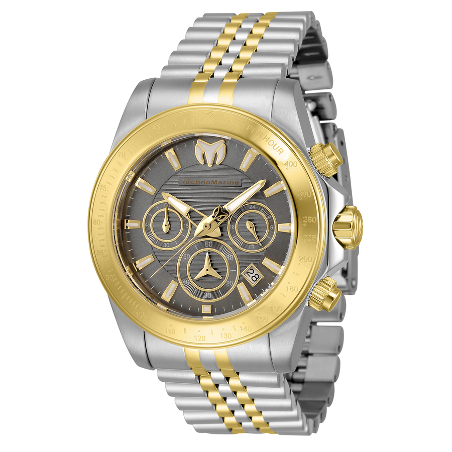 Stainless steel case with a two-tone (silver-tone and yellow gold-tone) stainless steel bracelet. Fixed yellow gold-tone bezel. Charcoal dial with luminous yellow gold-tone hands and index hour markers. Minute markers around the outer rim. Dial Type: Analog. Luminescent hands and markers. Date display between the4 and 5 o'clock positions. Chronograph - three sub-dials displaying: 60 second, 60 minute and 24 hour (GMT). Hattori caliber VD53 quartz movement. Scratch resistant mineral crystal. Screw down crown. Solid case back. Round case shape. Case size: 42 mm. Case thickness: 13 mm. Band width: 22 mm. Band length: 8.50 inches. Deployment clasp. Water resistant at 200 meters / 660 feet. Functions: chronograph, date, GMT, second time zone, hour, minute, second. Manta Ray Series. Sport watch style. Watch label: Japan Movt. Technomarine Manta Ray Charcoal Dial Mens Watch TM-220037.