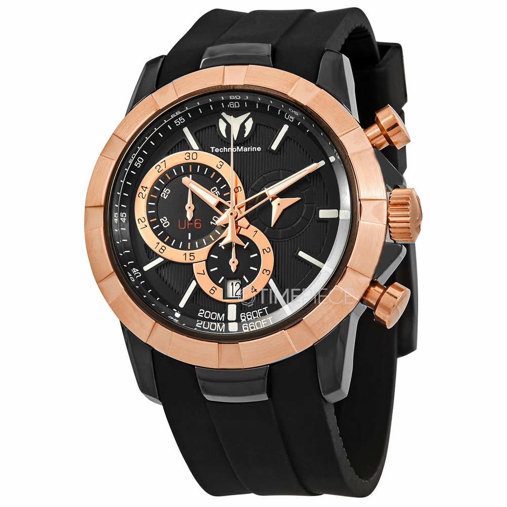 Black-plated stainless steel case with a black silicone strap. Fixed rose gold-tone and black-plated bezel. Black dial with luminous rose gold-tone hands and index hour markers. Arabic numeral minute markers (at 5 minute intervals). Minute markers around the outer rim. Dial Type: Analog. Luminescent hands. Date display at the 6 o'clock position. Chronograph - three sub-dials displaying: 60 second, 30 minute and 1/10th of a second. Ronda caliber 5040.D quartz movement. Scratch resistant Flame Fusion crystal. Screw down crown. Solid case back. Round case shape. Case size: 45 mm. Case thickness: 14 mm. Band width: 24 mm. Band length: 7.75 inches. Tang clasp. Water resistant at 200m. Functions: chronograph, big date, hour, minute, small second. Uf6 Series. Sport watch style. Watch label: Swiss Movt. Technomarine Uf6 Chronograph Quartz Black Dial Watch TM-615014.