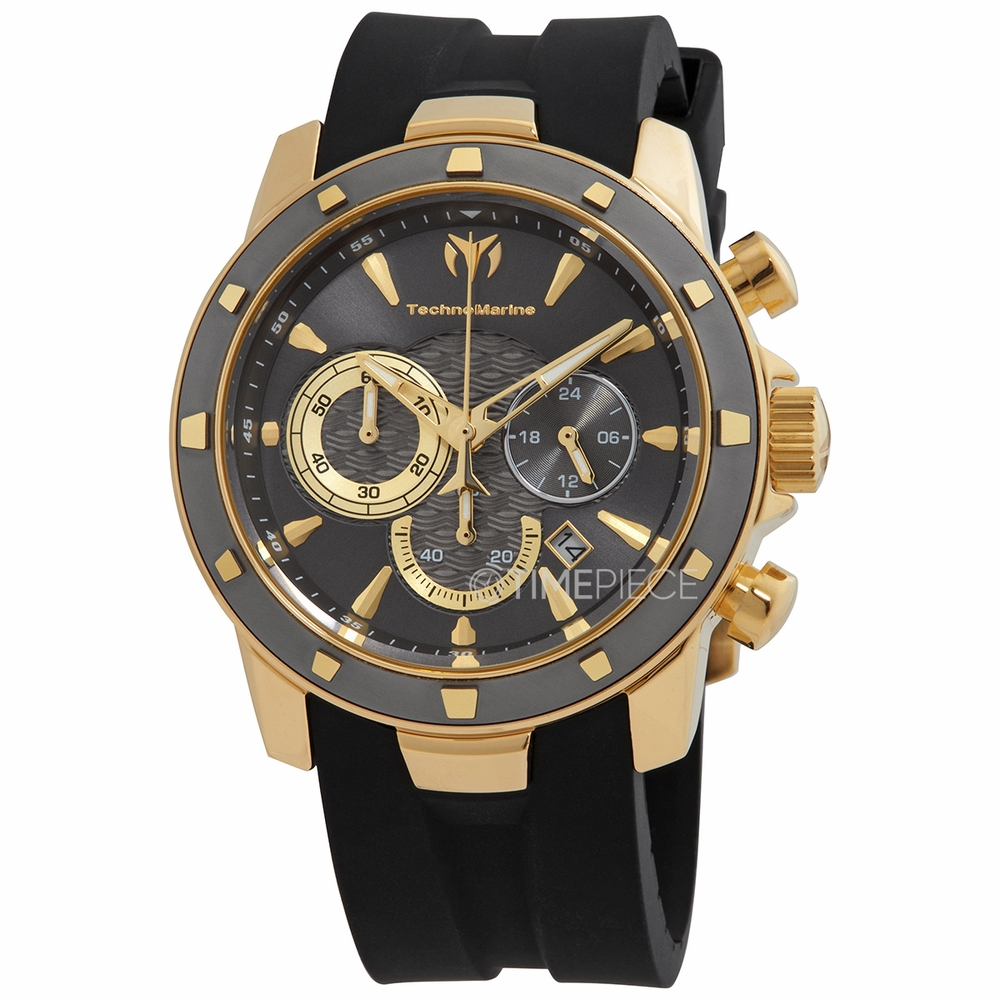 Gold-tone stainless steel case with a black silicone strap. Fixed gold-tone bezel with a gunmetal inlay. Charcoal dial with gold-tone hands and index hour markers. Arabic numeral minute markers (at 5 minute intervals) minute markers around the outer rim ). Dial Type: Analog. Luminescent hands and markers. Date display between the 4 and 5 o'clock positions. Chronograph - three sub-dials displaying: 60 second, 60 minute and 24 hour. Hattori caliber VD53 quartz movement. Scratch resistant Flame Fusion crystal. Pull / push crown. Solid case back. Round case shape. Case size: 45 mm. Band width: 24 mm. Band length: 7.75 inches. Tang clasp. Water resistant at 100 meters / 330 feet. Functions: chronograph, date, GMT, second time zone, hour, minute, second. Uf6 Series. Sport watch style. Watch label: Japan Movt. Technomarine UF6 Chronograph Quartz Charcoal Dial Mens Watch TM-621002.