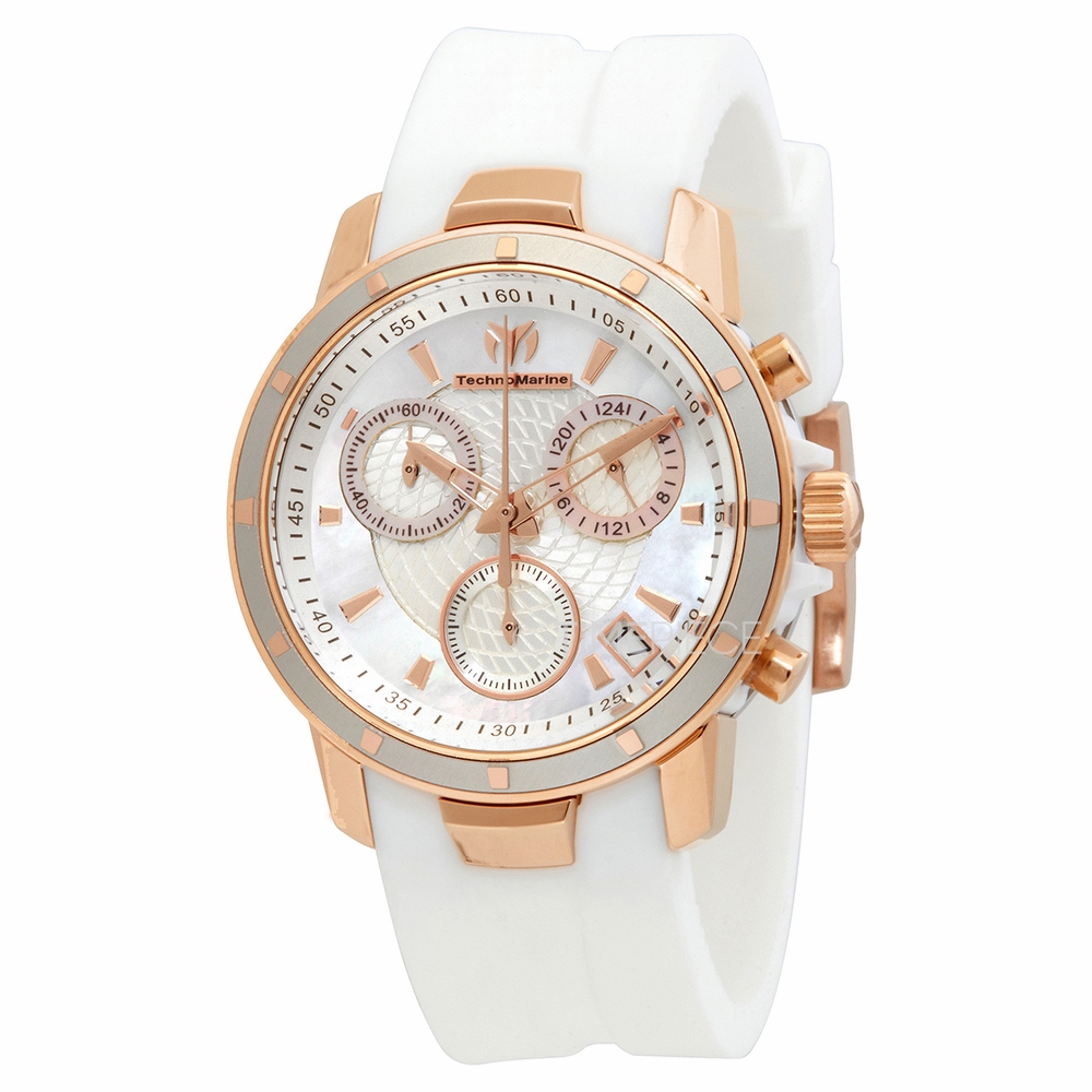 Rose gold-tone stainless steel case with a white silicone strap. Fixed rose gold-tone bezel with an inlaid white ring. Rose dial with rose gold-tone skeleton hands and index hour markers. Arabic numeral minute markers (at 5 minute intervals). Dial Type: Analog. Date display between the 4 and 5 o'clock positions. Chronograph - three sub-dials displaying: 60 second, 60 minute and 24 hour. SII caliber VK68A quartz movement. Scratch resistant sapphire crystal. Pull / push crown. Solid case back. Round case shape. Case size: 38 mm. Band width: 20 mm. Band length: 7.25 inches. Tang clasp. Water resistant at 100 meters / 330 feet. Functions: chronograph, date, GMT, second time zone, hour, minute, second. Uf6 Series. Sport watch style. Watch label: Japan Movt. Technomarine UF6 Chronograph Quartz Ladies Watch TM-619001.