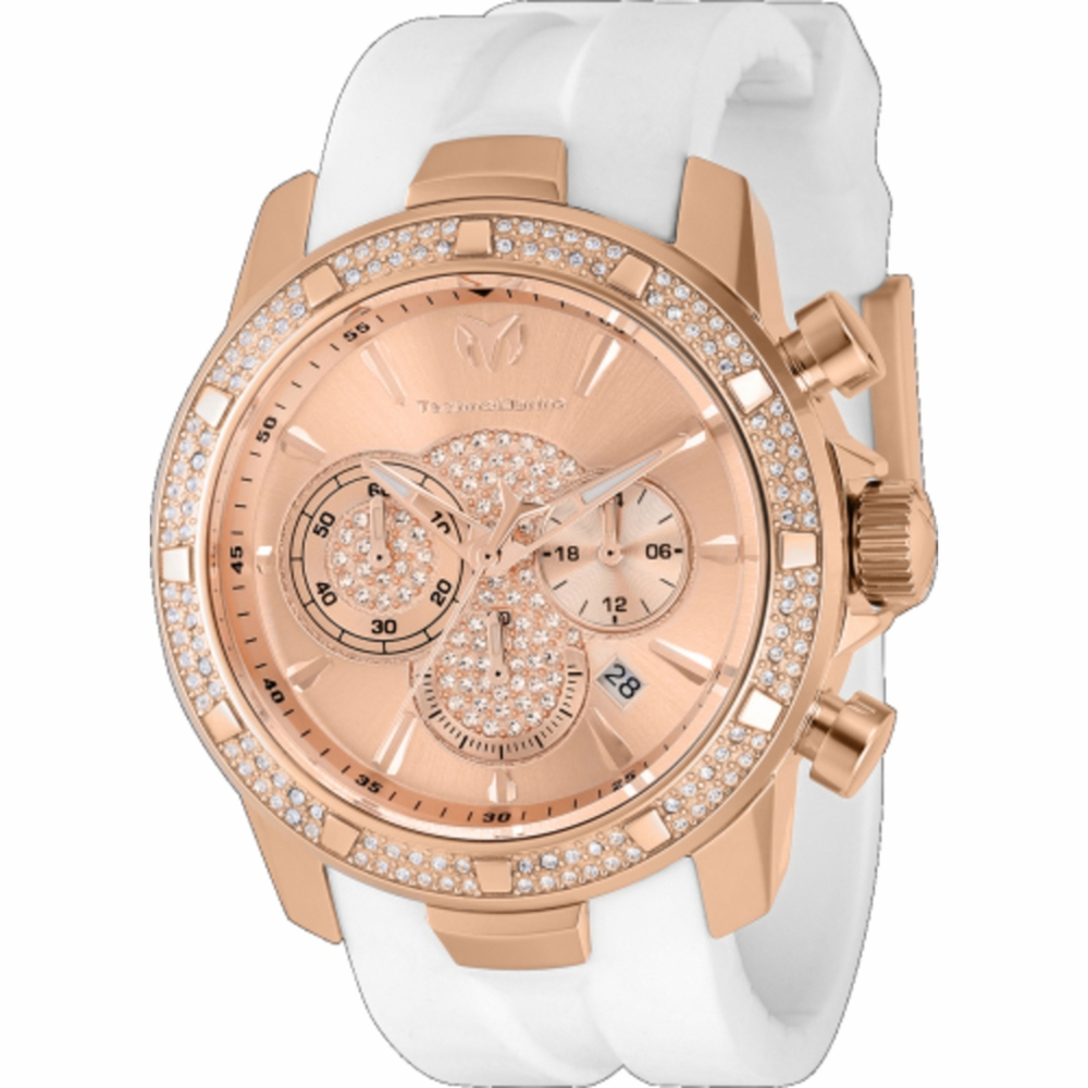 Blue stainless steel case with a black silicone strap. Rose gold-tone crystal set bezel. Mother of pearl rose gold-tone dial with rose gold-tone hands and index hour markers. Minute markers around the outer rim. Dial Type: Analog. Luminescent hands. Date display between 4 and 5 o'clock position. Chronograph - three sub-dials displaying: 60 second, 60 minute and 24 hour. Hattori Caliber VD53 quartz movement. Scratch resistant Flame Fusion crystal. Screw down crown. Solid case back. Round case shape, case size: 45 mm. Band width: 24 mm, band length: 7.75 inches. Buckle clasp. Water resistant at 100 meters / 330 feet. Functions: chronograph, date, GMT, second time zone, hour, minute, second. Uf6 Series. Casual watch style. Watch label: Japan Movt. Technomarine UF6 Chronograph Quartz Rose Gold Dial Mens Watch TM-621013.