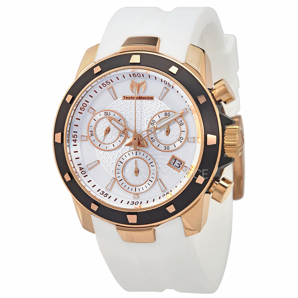 Rose gold-tone stainless steel case with a white silicone strap. Fixed rose gold-tone bezel with an inlaid black aluminum ring. Silver dial with luminous rose gold-tone hands and index hour markers. Arabic numeral minute markers (at 5 minute intervals). Minute markers around the outer rim. Dial Type: Analog. Luminescent hands and markers. Date display at the 4 o'clock position.Chronograph - two sub-dials displaying: 60 second and 30 minute. Day of the week sub-dial. Ronda Caliber Z60 quartz movement. Scratch resistant sapphire crystal. Screw down crown. Solid case back. Round case shape. Case size: 45 mm. Case thickness: 14 mm. Band width: 24 mm. Band length: 7.75 inches. Tang clasp. Water resistant at 200 meters / 660 feet. Functions: chronograph, date, day, hour, minute, small second. Uf6 Series. Sport watch style. Watch label: Swiss Movt. Technomarine UF6 Chronograph Quartz Silver Dial Mens Watch TM-615006.