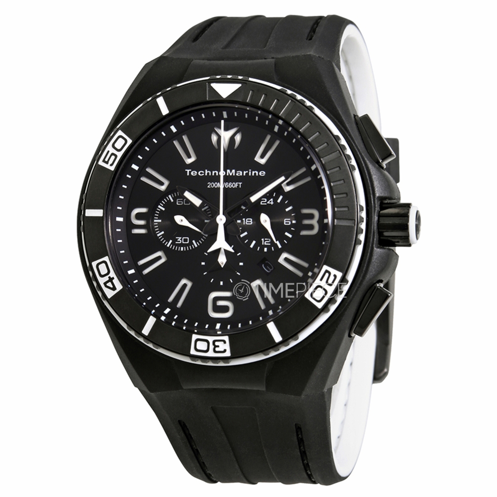 Black-plated stainless steel case with a black (white backed) silicone strap. Uni-directional rotating black-plated bezel with a white silicone insert. Black dial with luminous black hands and index hour markers. Arabic numerals mark the 3, 6, and 9 o'clock positions. Minute markers around the outer rim. Dial Type: Analog. Luminescent hands and markers. Date display between the 4 and 5 o'clock positions. Chronograph - three sub-dials displaying: 60 second, 60 minute and 24 hours. Technomarine calibre FS23 quartz movement. Scratch resistant mineral crystal. Screw down crown. Solid case back. Case size: 46.65 mm. Case thickness: 18.30 mm. Round case shape. Band width: 22 mm. Tang clasp. Water resistant at 200 meters / 660 feet. Functions: chronograph, date, hour, minute, second. Additional Info: suitable for professional marine activity serious surface water sports and skin diving. Sport watch style. Technomarine Cruise Night Vision Chronograph Black Dial Mens Watch 115023.