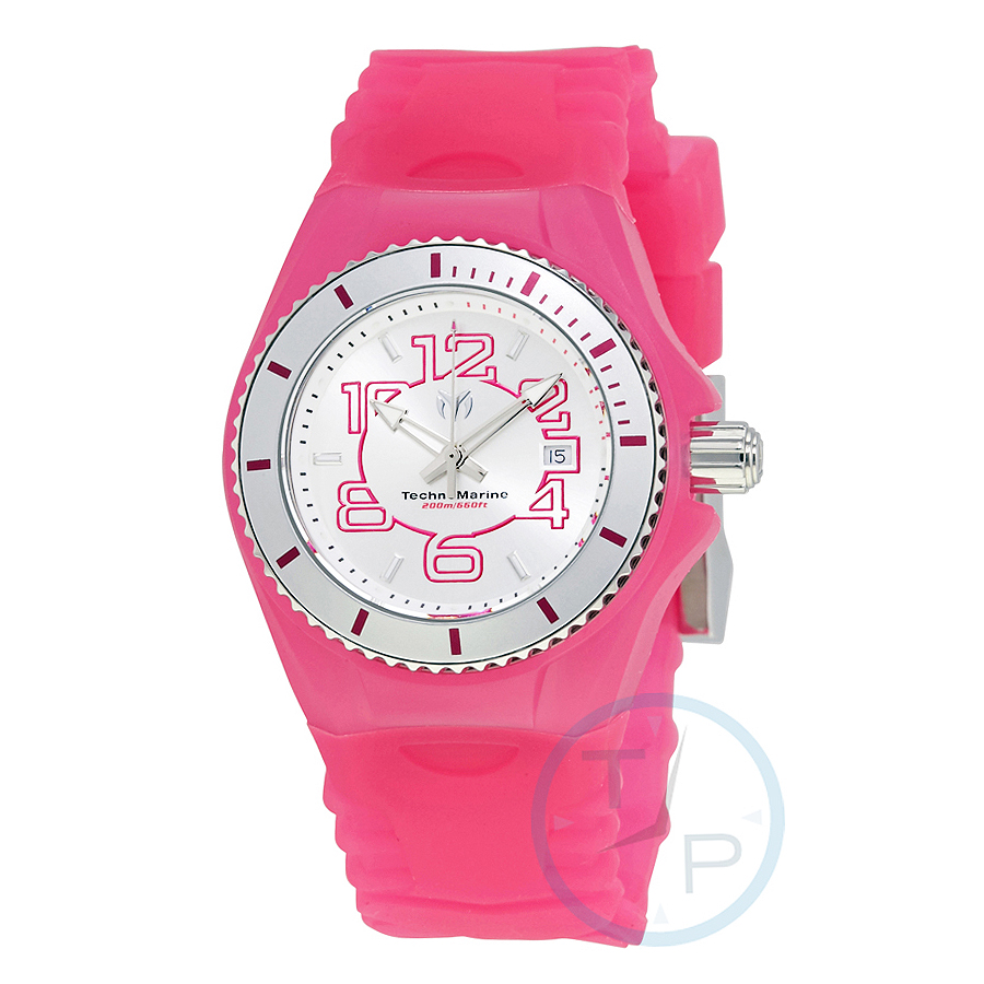 Stainless steel case with a pink silicone cover with a pink silicone strap. Uni-directional rotating silver-tone bezel. Silver dial with luminous silver-tone hands and alternating Arabic numeral and index hour markers. Minute markers around the outer rim. Dial Type: Analog. Luminescent hands and markers. Date display at the 3 o'clock position. Quartz movement. Scratch resistant flame fusion crystal. Screw down crown. Solid case back. Case size: 34 mm. Round case shape. Band width: 24 mm. Band length: 7.85 inches. Tang clasp. Water resistant at 200 meters / 660 feet. Functions: date, hour, minute, second. Additional Info: suitable for professional marine activity serious surface water sports and skin diving. Casual watch style. TechnoMarine Cruise JellyFish Ladies Watch 115127.