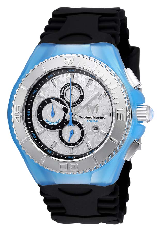 Stainless steel case with a removable silicone cover with a black silicone strap. Uni-directional rotating silver-tone bezel. Silver dial with luminous silver-tone hands and index hour markers. Minute markers around the outer rim. Dial Type: Analog. Luminescent hands and markers. Date display at the 4 o'clock position. ChronoThree sub-dials displaying: 60 second, 12 hour and 1/10th of a second. Miyota caliber OS60 quartz movement. Scratch resistant flame fusion crystal. Screw down crown. Solid case back. Case size: 46 mm. Case thickness: 13 mm. Round case shape. Band width: 29 mm. Band length: 8.25 inches. Tang clasp. Water resistant at 200 meters / 660 feet. Functions: chronograph, date, hour, minute, second. Casual watch style. Watch label: Japan Movt. TechnoMarine Cruise JellyFish Silver Dial Black Silicone Mens Watch 115192.
