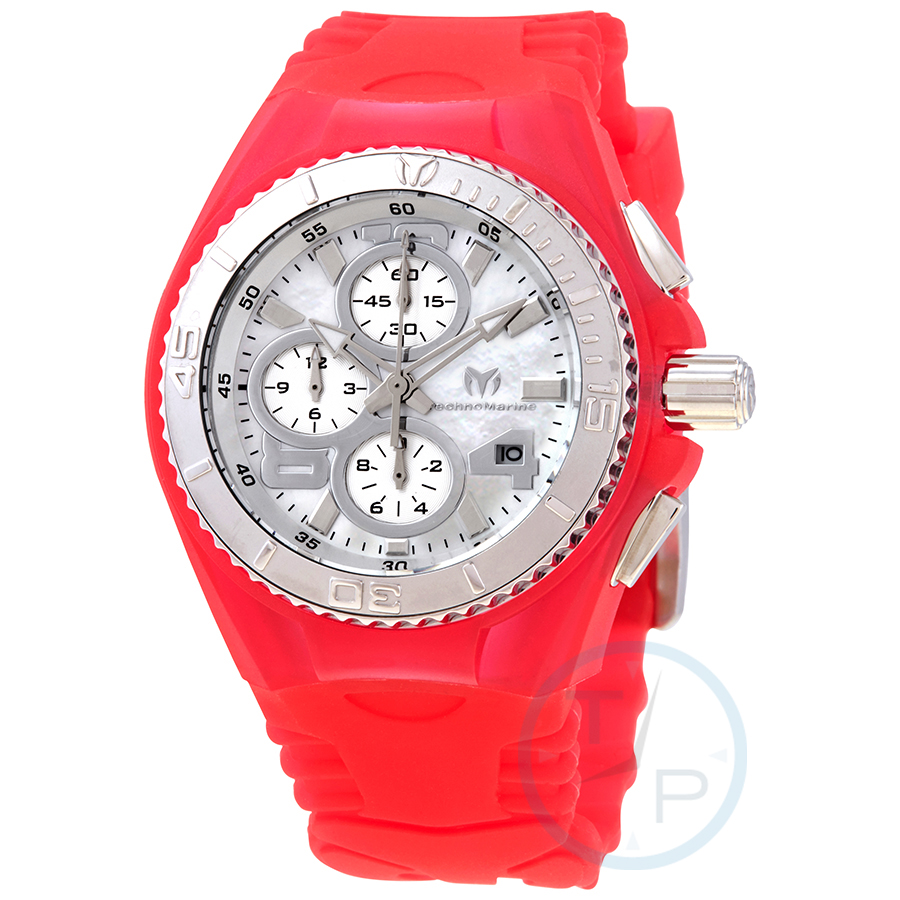 Stainless steel case with a pink silicone cover with a pink silicone strap. Uni-directional rotating silver-tone bezel. Mother of pearl dial with luminous silver-tone hands and index hour markers. Arabic numerals mark the 4, 8 and 12 o'clock positions. Minute markers around the outer rim. Dial Type: Analog. Luminescent hands. Date display at the 4 o'clock position. Chronograph - three sub-dials displaying: 60 second, 12 hour and 1/10th of a second. Miyota caliber OS60 quartz movement. Scratch resistant flame fusion crystal. Screw down crown. Solid case back. Round case shape. Case size: 40 mm. Case thickness: 13 mm. Band width: 26 mm. Tang clasp. Water resistant at 200 meters / 660 feet. Functions: chronograph, date, hour, minute, second. Additional Info: in general, suitable for professional marine activity and serious surface water sports, but not diving. Casual watch style. Watch label: Japan Movt. TechnoMarine Cruise JellyFish Chronograph Ladies Watch 115260.