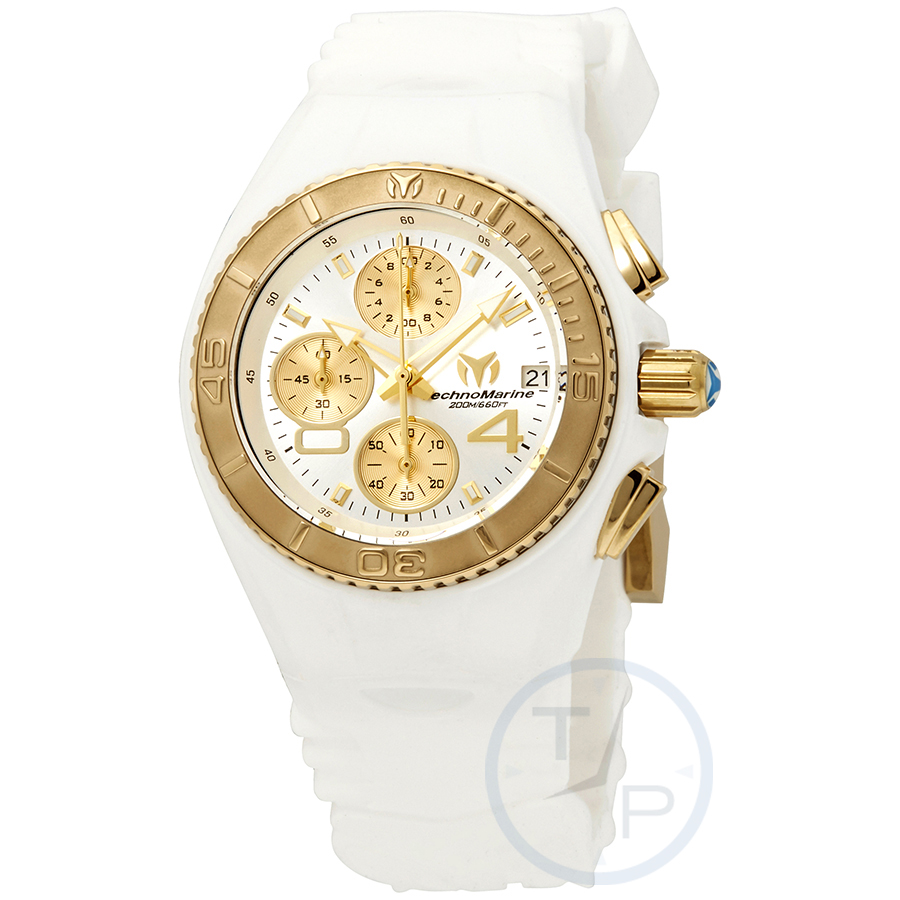 Gold-tone stainless steel case with a white silicone strap. Uni-directional rotating gold-tone bezel. Silver dial with luminous gold-tone hands and Arabic numeral hour markers. Minute markers around the outer rim. Dial Type: Analog. Luminescent hands and markers. Date display at the 3 o'clock position. Chronograph - three sub-dials displaying: 60 second, 60 minute and 1/10th of a second. Hattori caliber VD57 quartz movement. Scratch resistant flame fusion crystal. Screw down crown. Solid case back. Round case shape. Case size: 40 mm. Case thickness: 13 mm. Band width: 26 mm. Tang clasp. Water resistant at 200 meters / 660 feet. Functions: chronograph, date, hour, minute, second. Sport watch style. Watch label: Japan Movt. TechnoMarine JellyFish Chronograph Silver Dial Ladies Watch 115361.