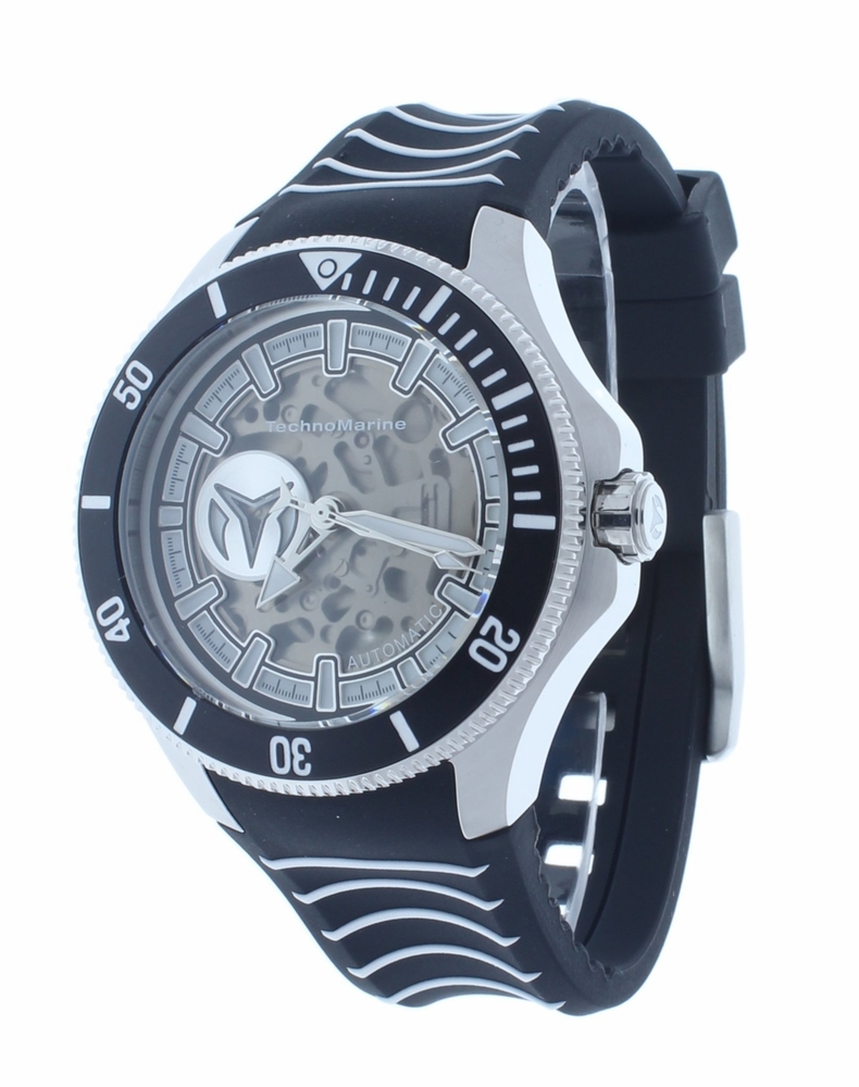 Silver-tone stainless steel case with a two-tone (black and white) silicone strap. Uni-directional rotating two-tone (black and white) stainless steel bezel. Skeleton dial with silver-tone hands and index hour markers. Minute markers around the outer rim. Dial Type: Analog. Luminescent hands and markers. SII Caliber NH70A automatic movement with a 41-hour power reserve. Scratch resistant mineral crystal. Pull / push crown. Transparent case back. Round case shape, case size: 46 mm, case thickness: 12 mm. Band width: 26 mm, band length: 8 inches. Buckle clasp. Water resistant at 100 meters / 330 feet. Functions: hour, minute, second. Casual watch style. Watch label: Japan Movt. Technomarine Cruise Shark Automatic Mens Watch TM-118019.