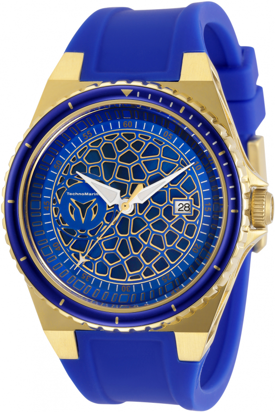 Yellow gold-tone stainless steel case with a blue silicone strap. Uni-directional rotating yellow gold-tone bezel with a blue ring. Blue dial with luminous silver-tone alpha-style hands and index hour markers. Arabic numeral minute markers (at 5 minute intervals). Minute markers around the outer rim. Dial Type: Analog. Luminescent hands. Date display at the o'clock position. Hattori calibre VJ42 quartz movement. Scratch resistant flame fusion crystal. Pull / push crown. Solid case back. Round case shape. Case size: 44 mm. Case thickness: 13 mm. Band width: 26 mm. Band length: 8.75 inches. Tang clasp. Water resistant at 100 meters / 330 feet. Functions: date, hour, minute, second. Easycell Technocell Series. Casual watch style. Watch label: Japan Movt. Technomarine Easycell Technocell Quartz Blue Dial Mens Watch TM-318055.