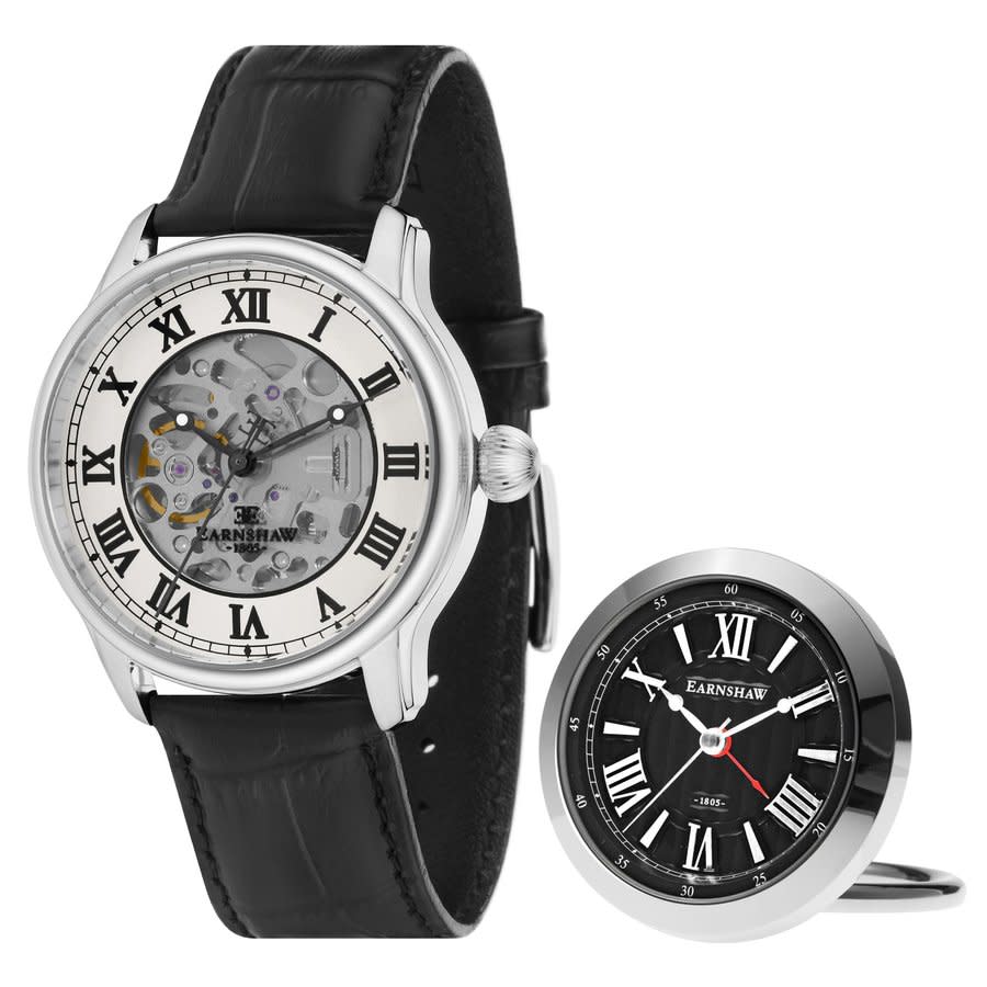 Stainless steel case with a black leather strap. Fixed stainless steel bezel. White (skeleton center) dial with black hands and Roman numeral hour markers. Minute markers around the outer rim. Dial Type: Analog. Luminescent hands. Automatic movement. Scratch resistant sapphire crystal. Pull / push crown. Transparent case back. Round case shape. Case size: 42 mm. Case thickness: 13.5 mm. Band width: 20 mm / 22 mm. Tang clasp. Water resistant at 50 meters / 165 feet. Functions: hour, minute, second. Longitude Series. Dress watch style. Thomas Earnshaw Longitude Automatic White Dial Mens Watch ES-8807-SETA-01.