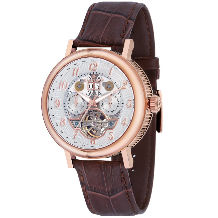 Rose gold-tone stainless steel case with a brown leather strap. Fixed coin edge rose gold-tone stainless steel bezel. White dial with rose gold-tone hands and Arabic numeral hour markers. Minute markers around the outer rim. Dial Type: Analog. Date display at the 12 o'clock position. Three sub-dials displaying: month, day and open heart. Automatic movement. Scratch resistant mineral crystal. Pull / push crown. Round case shape, case size: 43 mm. Buckle clasp. Water resistant at 50 meters / 165 feet. Functions: month, date, day, hour, minute, second. Beaufort Multi Automatic Series. Dress watch style. Thomas Earnshaw Beaufort Multi Automatic White Dial Mens Watch ES-8083-03.