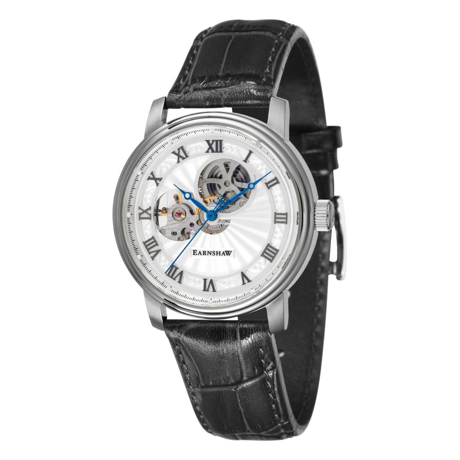 Stainless steel case with a black leather strap. Fixed stainless steel bezel. White 9open heart) dial with blue Breguet-style hands and black Arabic numeral hour markers. Minute markers around the outer rim. Dial Type: Analog. Hand wind movement. Scratch resistant mineral crystal. Transparent case back. Round case shape. Case size: 42 mm. Case thickness: 14.5 mm. Band width: 20 mm. Tang clasp. Water resistant at 50 meters / 165 feet. Functions: hour, minute, second. Westminster Mechanical Series. Dress watch style. Thomas Earnshaw Westminster Mechanical Hand Wind White Dial Mens Watch ES-8097-01.
