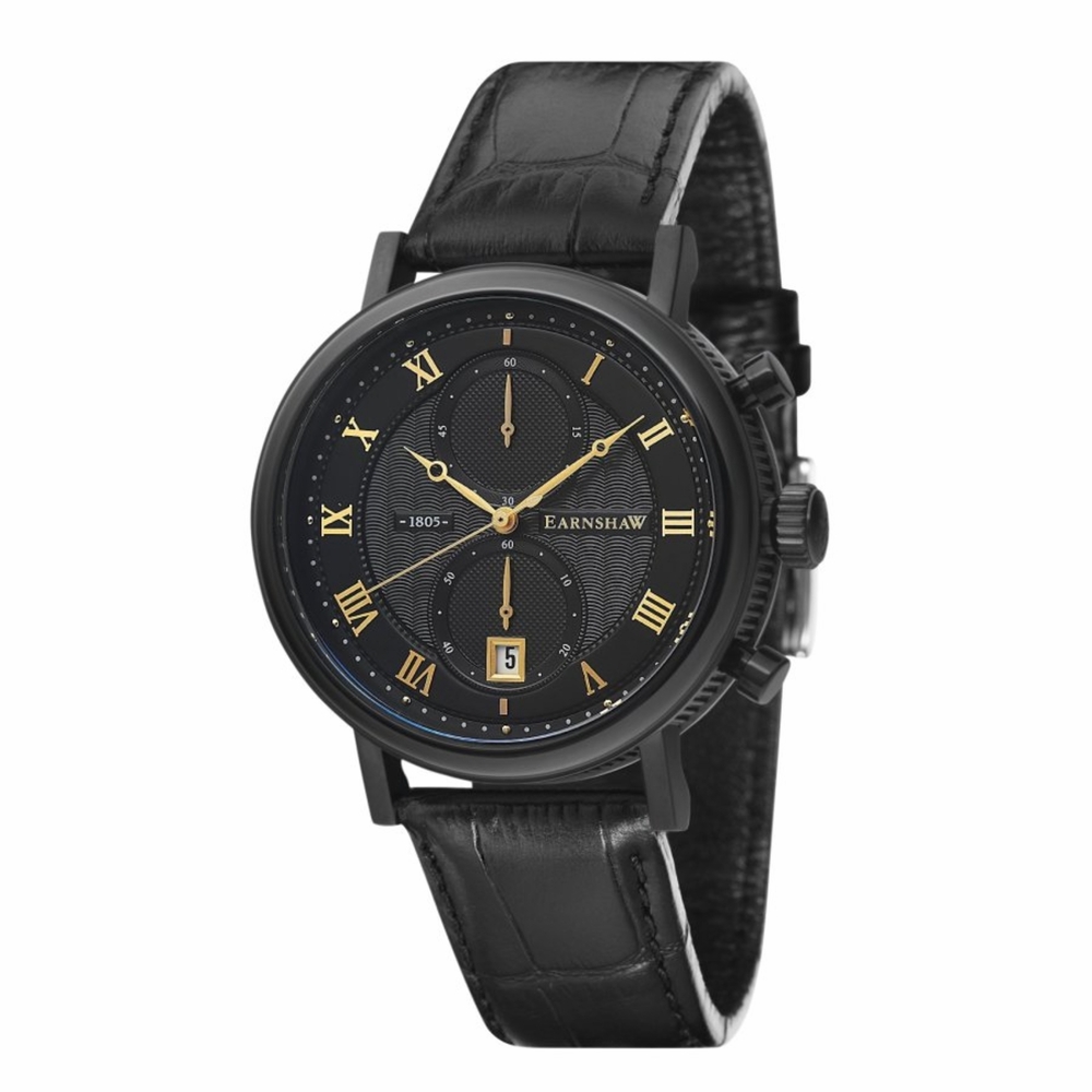 Black stainless steel case with a black leather strap. Fixed black bezel. Black dial with gold-tone hands and Roman numeral hour markers. Minute markers around the outer rim. Dial Type: Analog. Chronograph - two sub-dials displaying: 60 minutes, 60 seconds. Quartz movement. Round case shape. Case size: 43 mm. Buckle clasp. Functions: date, hour, minute, second. Dress watch style. Thomas Earnshaw Beaufort Multi-Function Quartz Black Dial Mens Watch ES-8100-06.