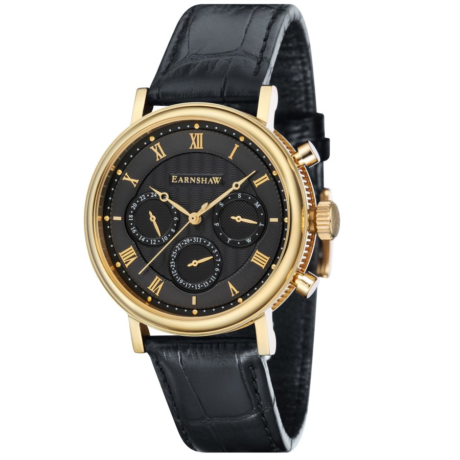 Gold-tone stainless steel case with a black leather strap. Fixed gold-tone bezel. Black dial with gold-tone Breguet-style hands and Roman numeral hour markers. Minute markers around the outer rim. Dial Type: Analog. Date display at the 6 o'clock position. Three multi-function sub-dials displaying: 24 hours, day of the week and date. Quartz movement. Scratch resistant mineral crystal. Pull / push crown. Solid case back. Round case shape. Case size: 43 mm. Case thickness: 12 mm. Band width: 22 mm. Buckle clasp. Water resistant at 50 meters / 165 feet. Functions: date, day, hour, minute, second, GMT. Dress watch style. Watch label: Japan Movt. Thomas Earnshaw Beaufort Multi-Function Quartz Black Dial Mens Watch ES-8103-04.