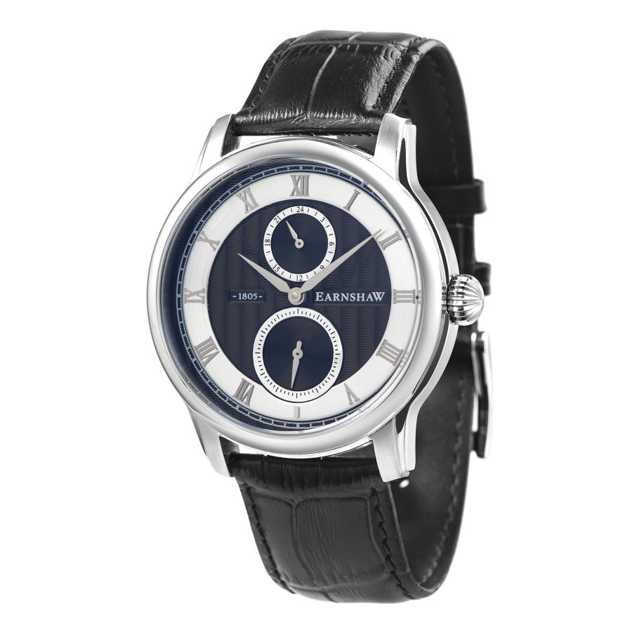 Silver-tone stainless steel case with a black leather strap. Fixed silver-tone stainless steel bezel. Black dial with silver-tone hands and Roman numeral hour markers. Minute markers around the outer rim. Dial Type: Analog. Two - small seconds, 24 hours subdials. Quartz movement. Scratch resistant mineral crystal. Pull / push crown. Solid case back. Round case shape, case size: 42 mm, case thickness: 11.5 mm. Band width: 22 mm. Buckle clasp. Water resistant at 50 meters / 165 feet. Functions: hour, minute, second. Dress watch style. Watch label: Japan Movt. Thomas Earnshaw Longitude Multi-Function Quartz Black Dial Mens Watch ES-8106-04.