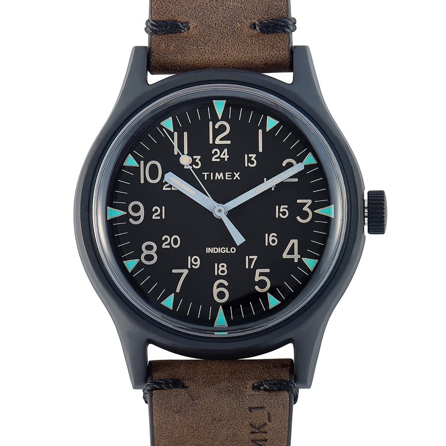 Black stainless steel case with a brown leather strap. Fixed black stainless steel bezel. Black dial with black hands and Arabic numeral hour markers. Minute markers around the outer rim. Dial Type: Analog. Luminescent hands and markers. Quartz movement. Solid case back. Round case shape, case size: 40 mm. Buckle clasp. Water resistant at 30 meters / 100 feet. Functions: hour, minute, second. MK1 Series. Casual watch style. Timex MK1 Quartz Black Dial Mens Watch TW2R96900.