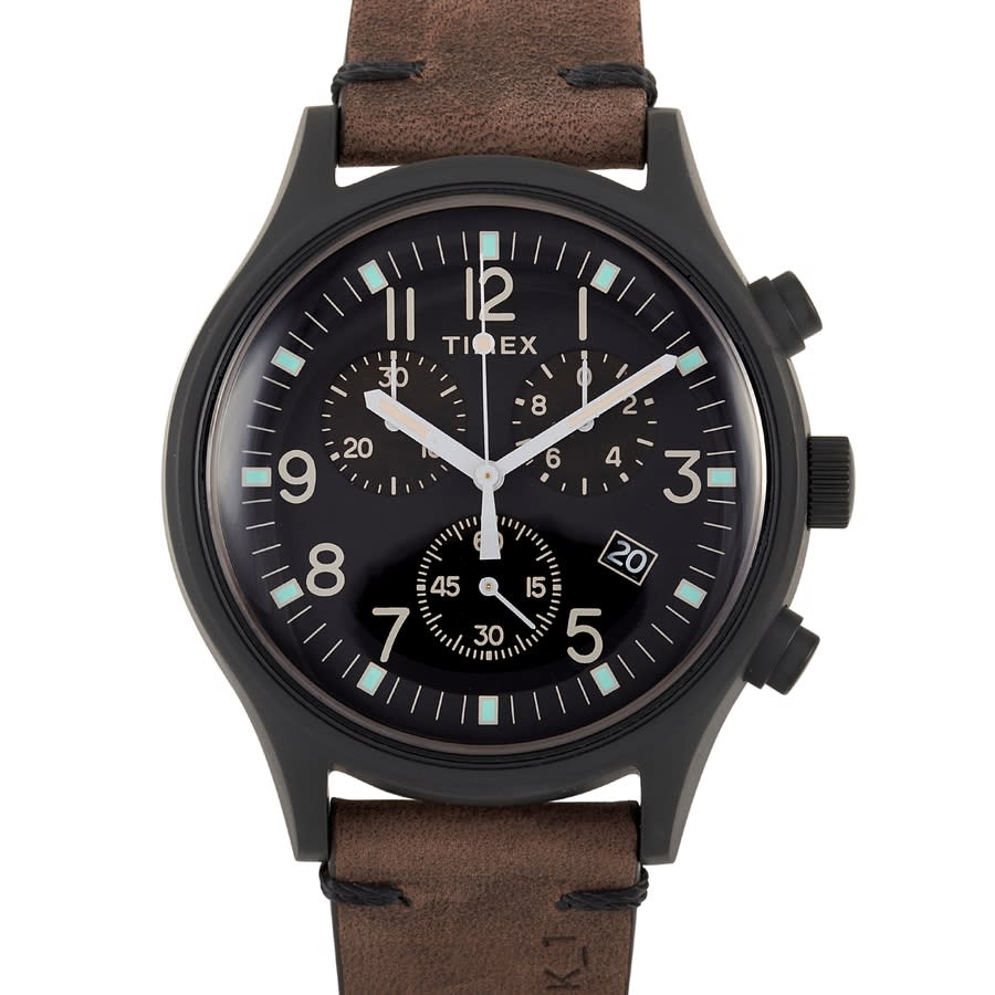 Black-plated brass case with a brown leather strap. Fixed black-plated brass bezel. Black dial with luminous silver-tone hands and Arabic numeral hour markers. Minute markers around the outer rim. Dial Type: Analog. Luminescent hands and markers. Date display at the 4 o'clock position. Chronograph - three sub-dials displaying: 60 second, 30 minute and 1/10th of a second. Quartz movement. Scratch resistant mineral crystal. Pull / push crown. Solid case back. Round case shape. Case size: 42 mm. Case thickness: 13 mm. Band width: 20 mm. Tang clasp. Water resistant at 30 meters / 100 feet. Functions: chronograph, date, hour, minute, second. MK1 Series. Luxury watch style. Timex MK1 Chronograph Quartz Black Dial Mens Watch TW2R96500.