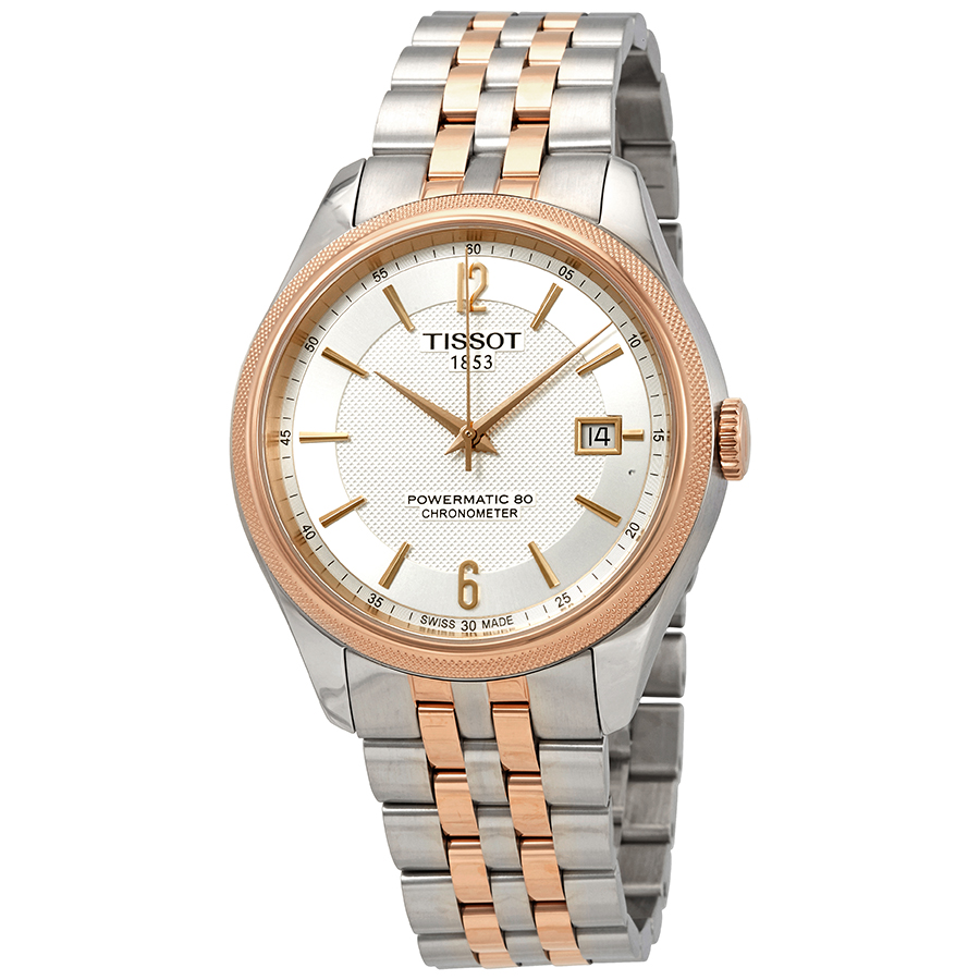 Rose gold PVD stainless steel case with a two-tone (silver-tone and rose gold PVD) stainless steel bracelet. Fixed rose gold PVD bezel. Silver dial with rose gold-tone hands and index hour markers. Arabic numerals appear at the 6 and 12 o'clock positions. Arabic numeral minute markers (at 5 minute intervals). Minute markers around the outer rim. Dial Type: Analog. Date display at the 3 o'clock position. Powermatic 80.811 automatic movement, based upon ETA 2824-2, containing 25 Jewels, bitting at 21600 vph, and has a power reserve of approximately 80 hours. Scratch resistant sapphire crystal. Pull / push crown. Transparent case back. Round case shape. Case size: 41 mm. Case thickness: 9.8 mm. Band width: 20 mm. Butterfly clasp. Water resistant at 50 meters / 165 feet. Functions: date, hour, minute, second. Ballade Series. Casual watch style. Watch label: Swiss Made. Tissot Ballade Automatic Silver Dial Mens Watch T108.408.22.037.01.