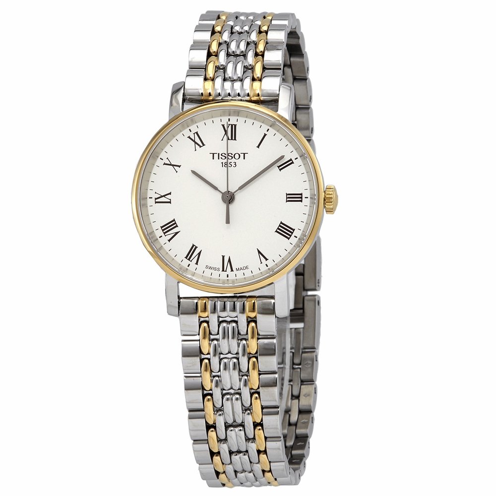 Stainless steel case with a two-tone (silver-tone and yellow gold PVD ) stainless steel bracelet. Fixed yellow gold PVD bezel. Silver dial with black hands and Roman numeral hour markers. Minute markers around the outer rim. Dial Type: Analog. ETA caliber 902.101 quartz movement. Scratch resistant sapphire crystal. Pull / push crown. Solid case back. Round case shape. Case size: 30 mm. Case thickness: 6.15 mm. Band width: 15 mm. Jewelry clasp. Water resistant at 30 meters / 100 feet. Functions: hour, minute, second, battery eol indicator. Casual watch style. Watch label: Swiss Made. Tissot Everytime Quartz Silver Dial Ladies Watch T109.210.22.033.00.