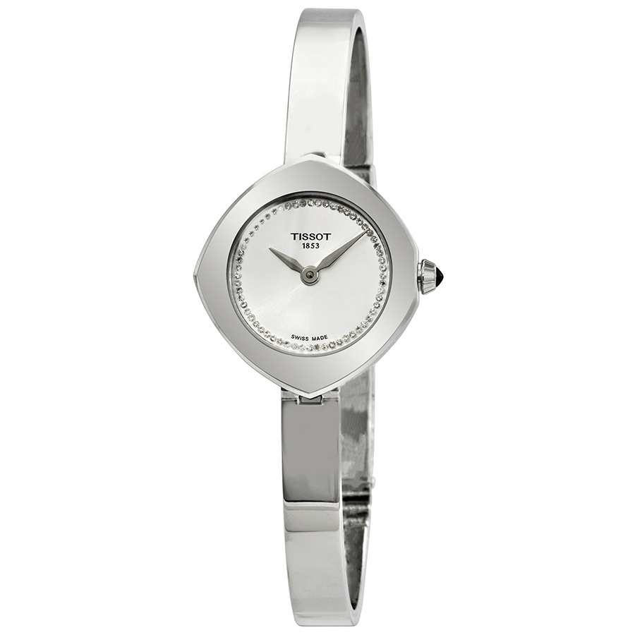 Stainless steel case with a stainless steel bracelet. Fixed stainless steel bezel. Silver diamond-set dial with silver-tone hands. Dial Type: Analog. ETA Caliber 901.001 quartz movement. Scratch resistant sapphire crystal. Pull / push crown. Solid case back. Cushion case shape. Case size: 23 mm. Case thickness: 6.05 mm. Butterfly clasp. Water resistant at 30 meters / 100 feet. Functions: hour, minute. Dress watch style. Watch label: Swiss Made. Tissot Femini-T Diamond Silver Dial Ladies Watch T113.109.11.036.00.