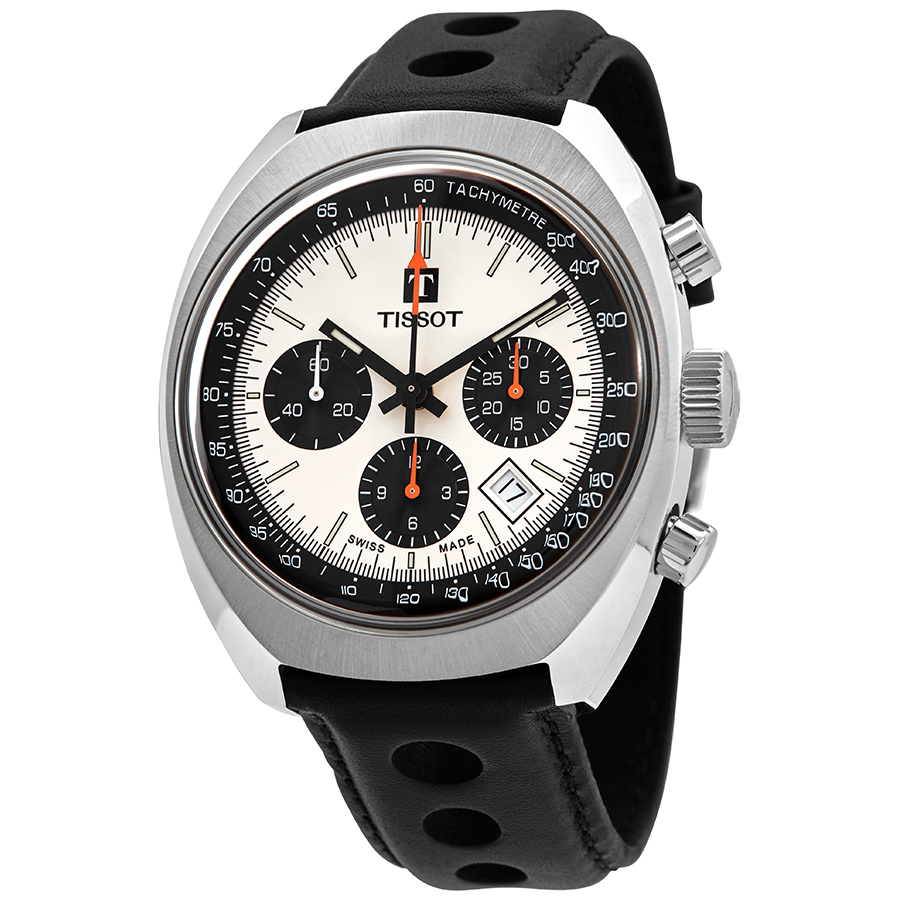 Stainless steel case with a black leather strap. Fixed stainless steel bezel. Silver dial with luminous black hands and index hour markers. Minute markers. Tachymeter markings around the outer rim. Dial Type: Analog. Luminescent hands and markers. Date display between the 4 and 5 o'clock positions. Chronograph - three black sub-dials displaying: 60 second, 30 minute and 12 hours. ETA-Valjoux caliber 7753 automatic movement, based upon ETA 7750, containing 27 Jewels, bitting at 28800 vph, and has a power reserve of approximately 44 hours. Scratch resistant sapphire crystal. Transparent case back. Tonneau case shape. Case size: 46.6 mm. Case thickness: 14.8 mm. Band width: 22 mm. Deployment clasp. Water resistant at 100 meters / 330 feet. Functions: chronograph, tachymeter, date, hour, minute, second. Additional Info: limited edition of 1973 pieces. Sport watch style. Watch label: Swiss Made. Tissot Heritage Chronograph Automatic Silver Dial Mens Watch T124.427.16.031.00.