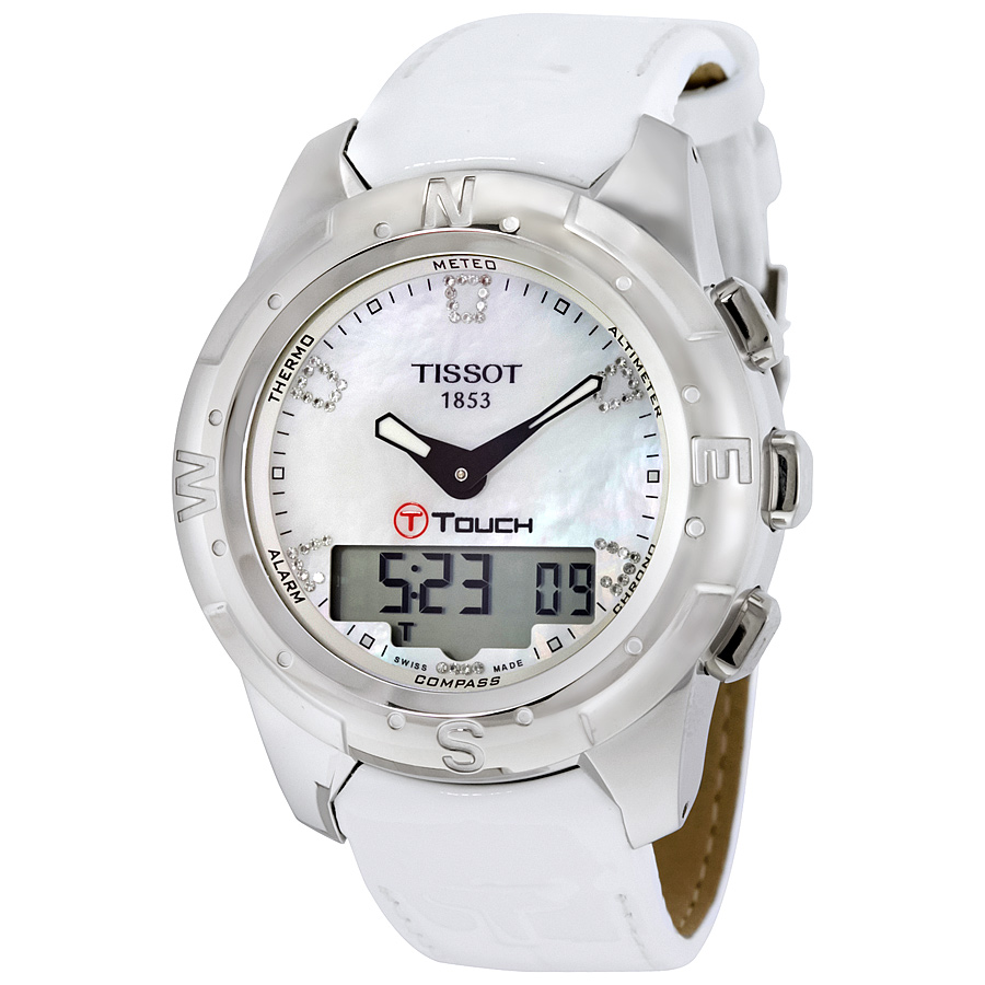 The beautiful Tissot T047.220.46.116.00 watch features a titanium 43mm case, with a fixed bezel, and a mother of pearl dial covered by a scratch resistant sapphire crystal. The stylish wristwatch is equipped with an exclusive 17.8mm leather which combines comfort and sturdiness. This horological trendy device has perpetual calendar, chronograph, world time, alarm, date, day, GMT, second time zone, hour, minute, second, battery eol indicator, thermometer, altitude indicator, compass functions.