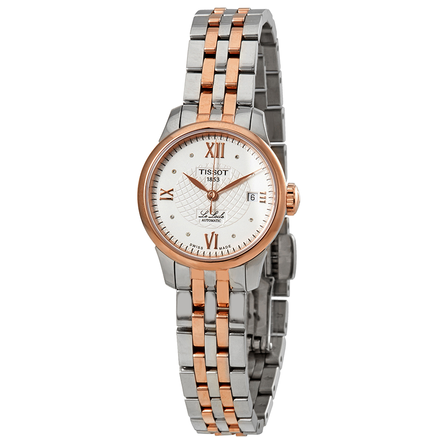 Silver-tone stainless steel case with a two-tone (silver-tone and rose gold PVD) stainless steel bracelet. Fixed rose gold PVD stainless steel bezel. Silver dial with rose gold-tone leaf-style shape hands and diamond hour markers. Roman numerals mark the 3, 6, 9 and 12 o'clock positions. minute markers around the outer rim. Dial Type: Analog. Date display at the 3 o'clock position. ETA Caliber 2671 Automatic movement, containing 25 Jewels, bitting at 28800 vph, and has a power reserve of approximately 38 hours. Scratch resistant sapphire crystal. Pull / push crown. Solid case back. Round case shape, case size: 25.3 mm, case thickness: 8.4 mm. Band width: 12 mm. Butterfly clasp. Water resistant at 30 meters / 100 feet. Functions: date, hour, minute, second. Casual watch style. Watch label: Swiss Made. Tissot Le Locle Silver Diamond Dial Automatic Two Tone Ladies Watch T41.2.183.16.