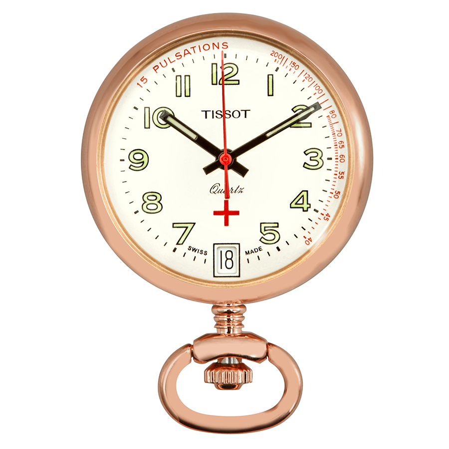 Rose gold PVD 316L stainless steel case. Fixed rose gold PVD bezel. Beige dial with black hands and Arabic numeral hour markers. Minute markers. Pulsations markings around the outer rim. Dial Type: Analog. Luminescent hands and markers. Date display at the 6 o'clock position. ETA caliber F06.111 quartz movement. Scratch resistant hesalite crystal. Solid case back. Round case shape. Case size: 30.1 mm. Case thickness: 8.4 mm. Functions: date, hour, minute, second. T-pocket Series. Casual watch style. Watch label: Swiss Made. Tissot T-Pocket Quartz Unisex Pocket Watch T81.7.223.92.