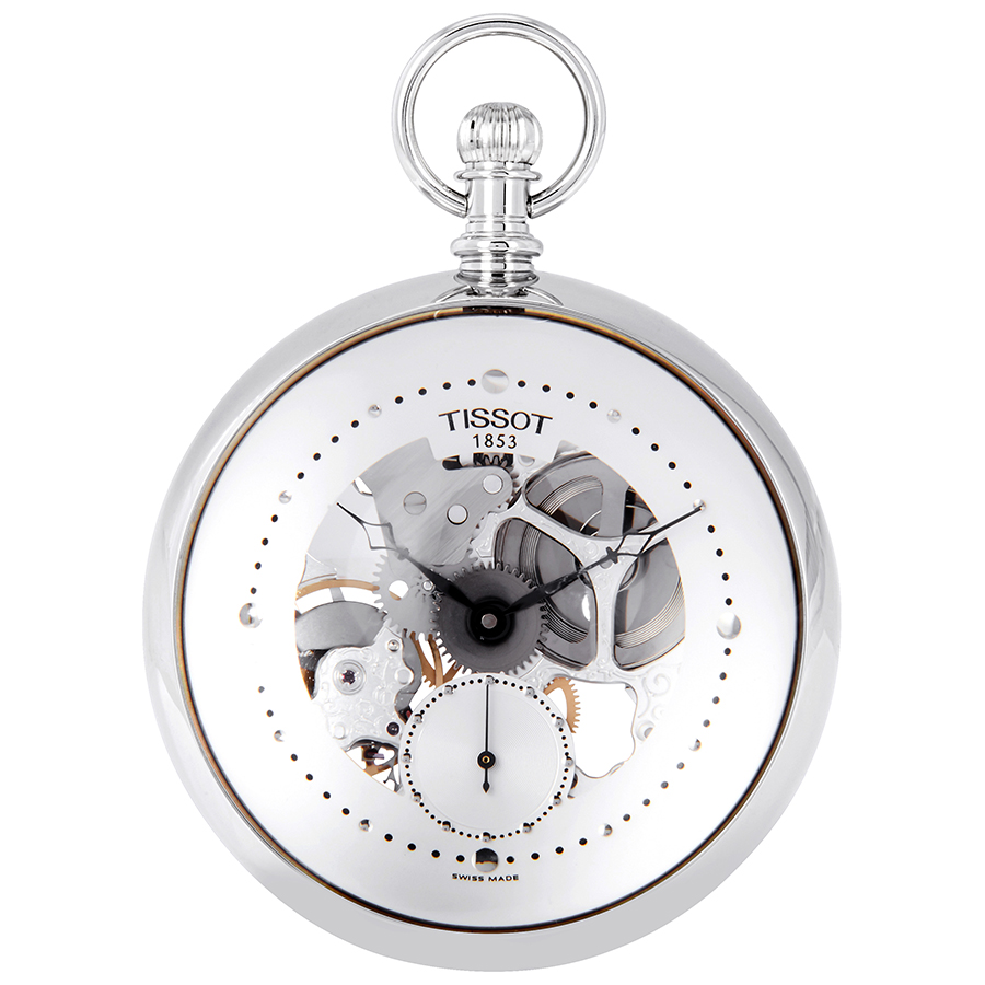 Silver-tone palladium plated brass case. Fixed silver-tone palladium plated brass bezel. Silver dial with black Breguet-style shape hands and dot hour markers. Minute markers around the outer rim. Dial Type: Analog. One- small seconds subdials. ETA Caliber 6497 quartz movement with a 46-hour power reserve. Scratch resistant mineral crystal. Pull / push crown. Transparent case back. Round case shape, case size: 73.77 mm, case thickness: 72.3 mm. Water resistant at 30 meters / 100 feet. Functions: hour, minute, second. Casual watch style. Watch label: Swiss Made. Tissot Specials Mechanical Pocket Watch T82.6.611.31.