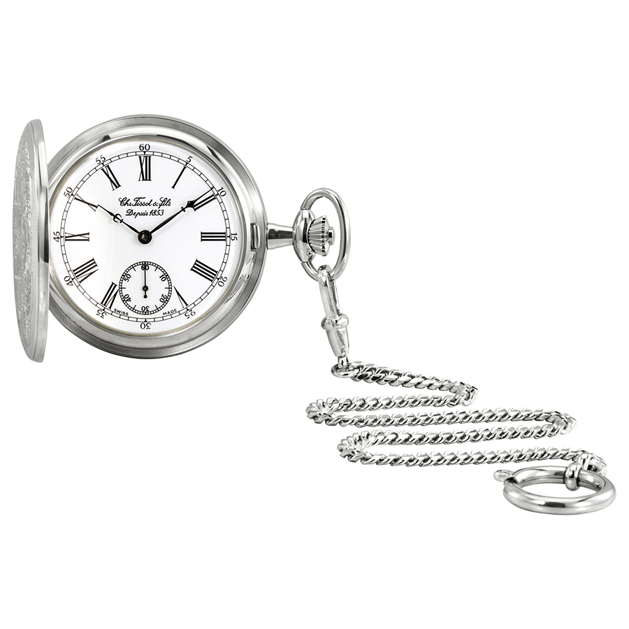 Silver-tone stainless steel case. Fixed silver-tone stainless steel bezel. Silver dial with black hands and Roman numeral hour markers. Minute scale around the inner rim. Dial Type: Analog. One- small seconds subdials. ETA Caliber 6498-1 hand wind movement with a 46-hour power reserve. Scratch resistant mineral crystal. Solid case back. Round case shape, case size: 49 mm, case thickness: 10.8 mm. Functions: hour, minute, second. Casual watch style. Watch label: Swiss Made. Tissot Savonnette Silver Dial Hand Wound Pocket Watch T83.6.454.13.